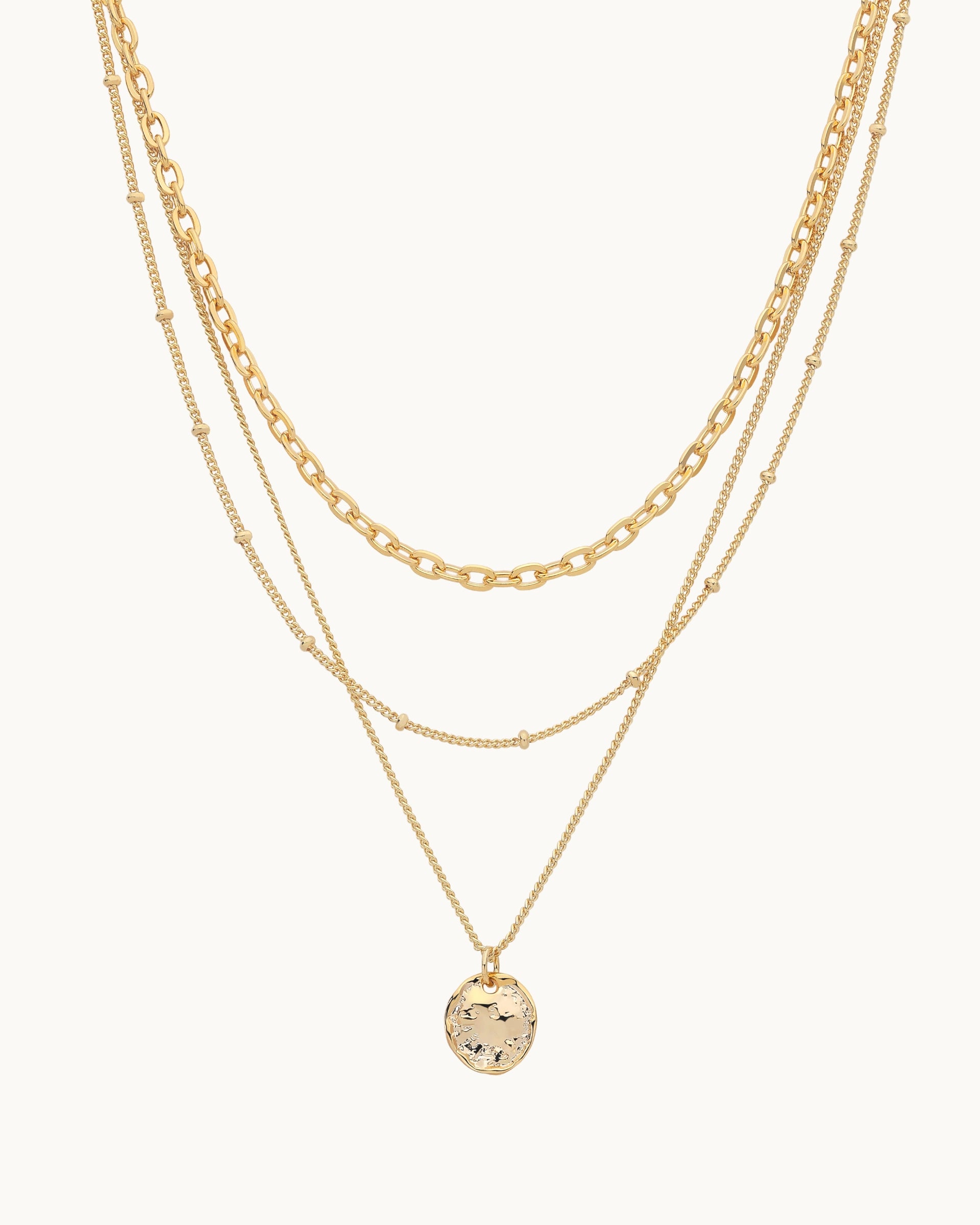 This layered necklace set features a bold mix of chain styles anchored by a textured coin pendant for a modern, statement-ready look. The contrast between the chunky top chain and finer layered chains below adds depth and visual interest, making it easy to style from day to night.
