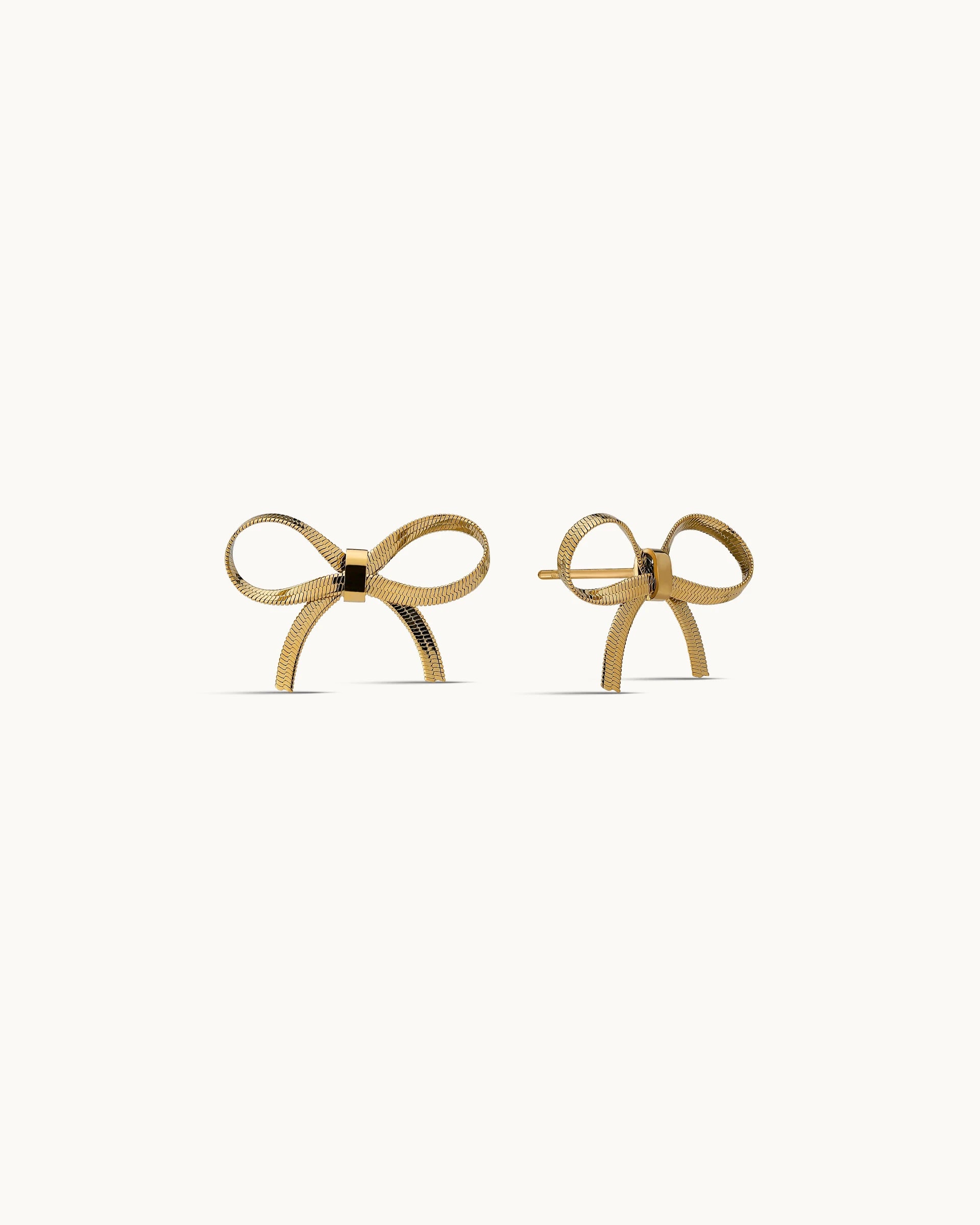 These earrings feature a delicate bow silhouette crafted with a fine textured finish that adds subtle dimension and detail. The structured loops and softly curved tails create a playful yet refined design that feels feminine and modern.