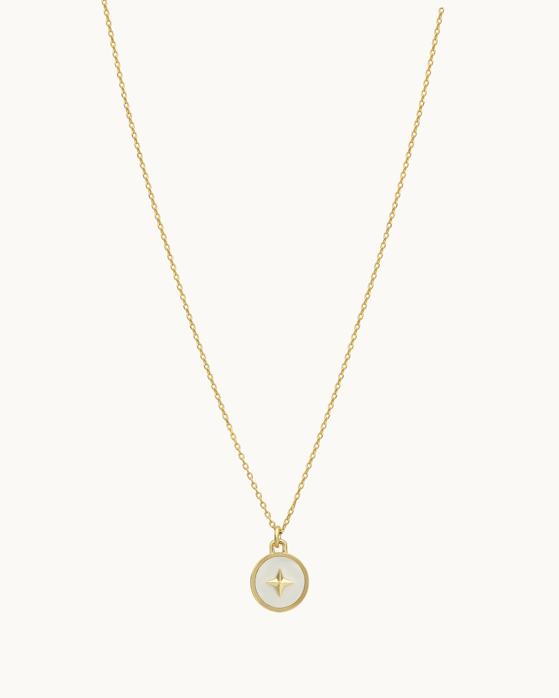Timeless and radiant, this necklace showcases a round medallion pendant adorned with a raised star motif at its centre. The smooth inlay backdrop highlights the sculpted star detail, giving the piece a refined and contemporary finish.