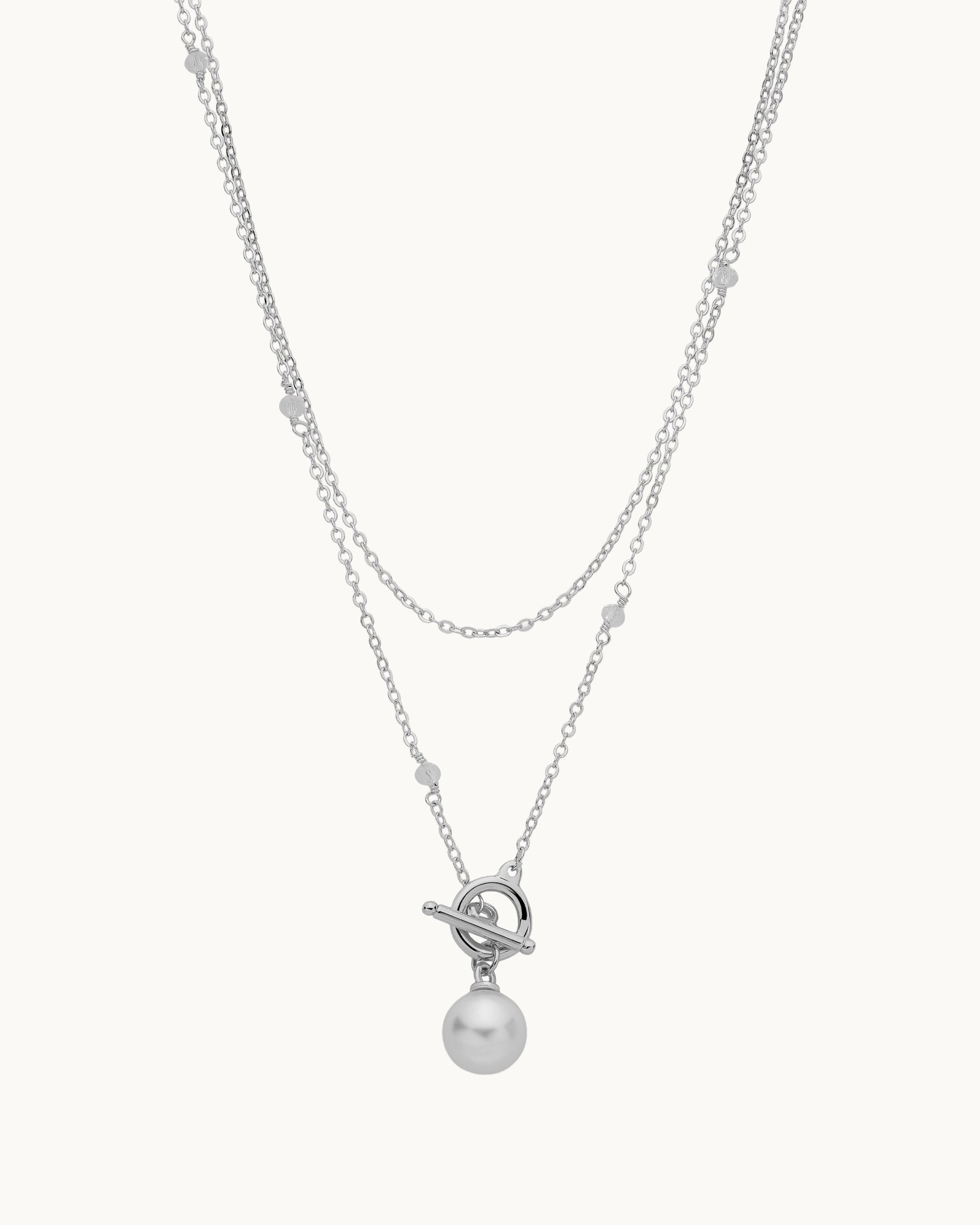This layered necklace features a delicate mix of fine chains accented with subtle beading and finished with a classic toggle pendant that holds a single pearl. Together, the details create a softly elevated look that feels both modern and timeless, perfect for adding an easy touch of refinement to any outfit.