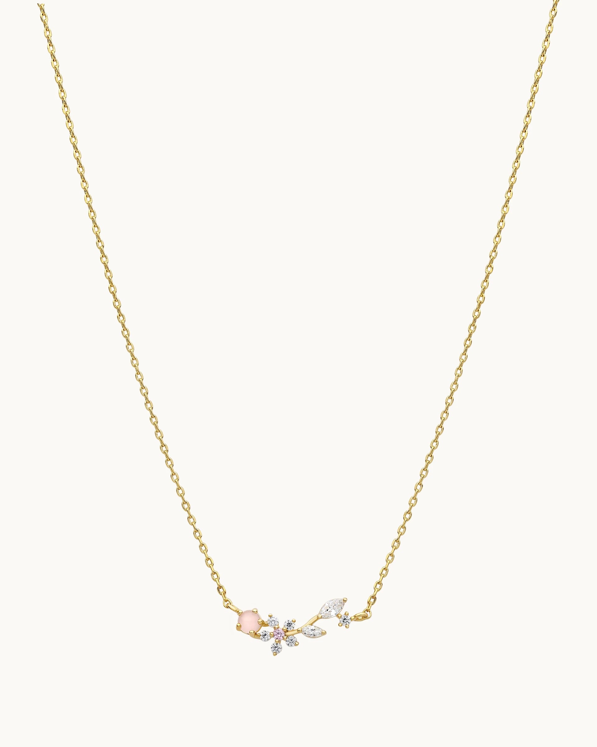Graceful and feminine, this necklace features a delicate floral branch pendant adorned with sparkling cubic zirconia and soft stone accents. The combination of marquise and round-cut stones creates a refined cluster design that mimics blooming petals, adding dimension and subtle brilliance along the neckline.