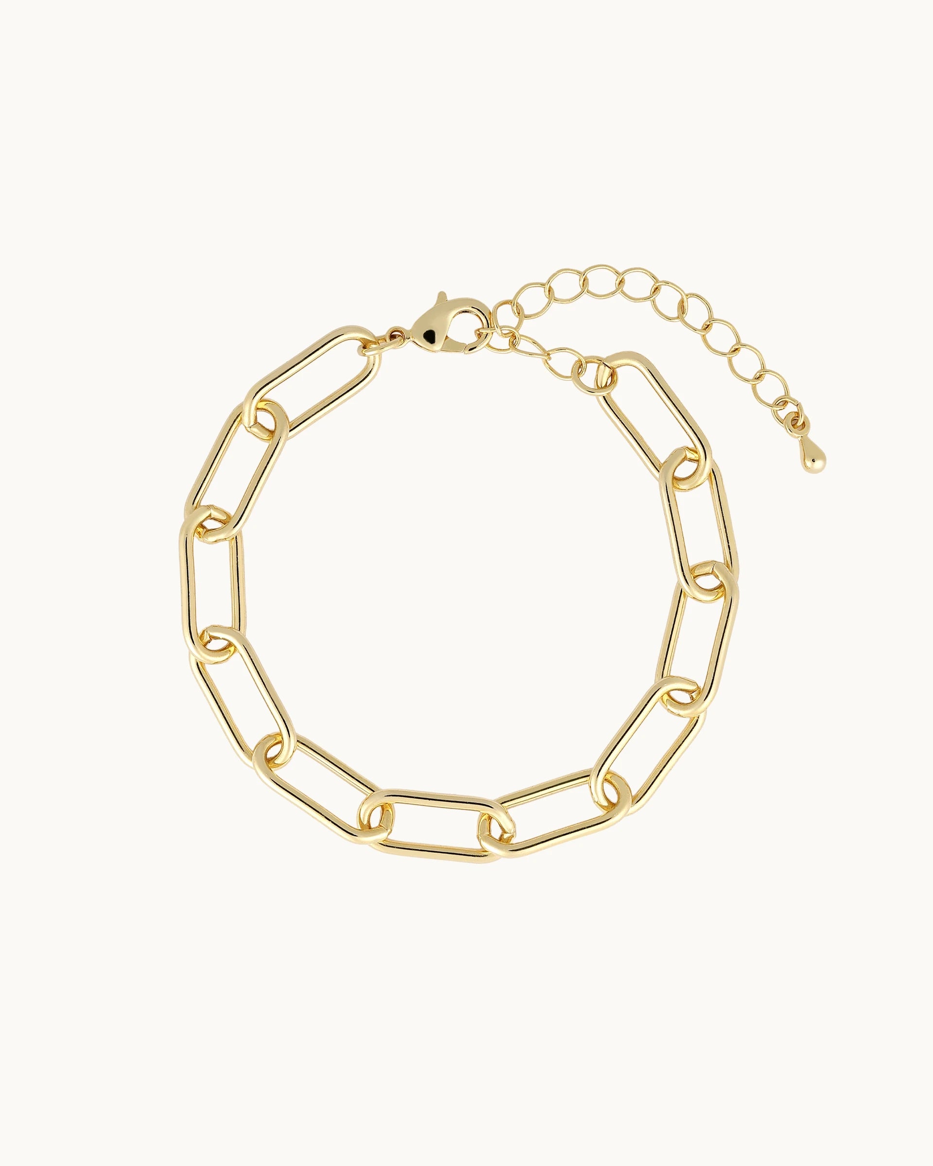 This bracelet showcases bold, elongated chain links that create a modern statement while maintaining timeless appeal. Its sleek, versatile design makes it easy to style solo for a minimalist look or layered with other pieces for added edge.