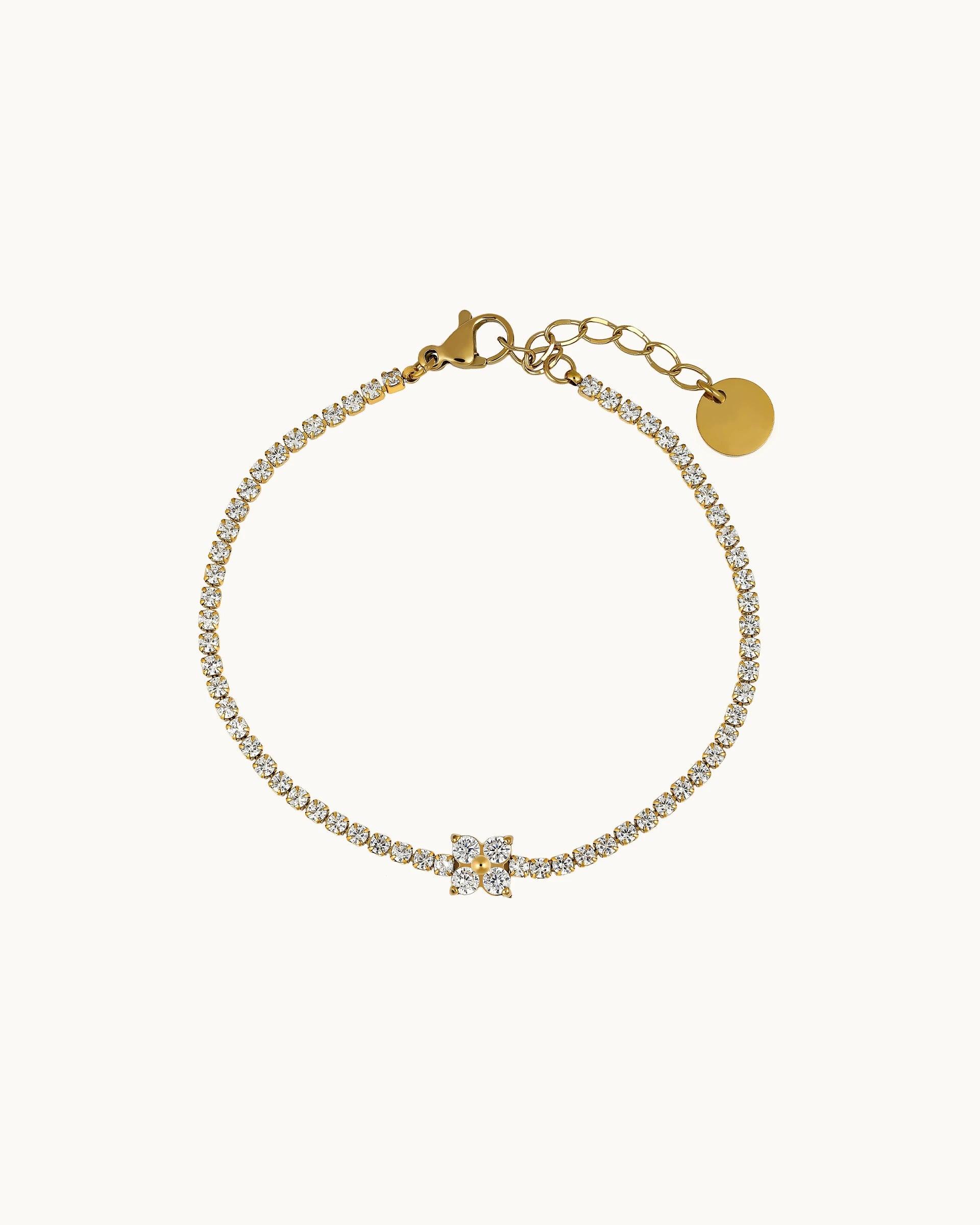A refined and radiant design, this bracelet showcases a continuous row of sparkling cubic zirconia, centred with a petite floral cluster for added brilliance. The symmetrical arrangement creates a timeless tennis silhouette with subtle decorative detail.