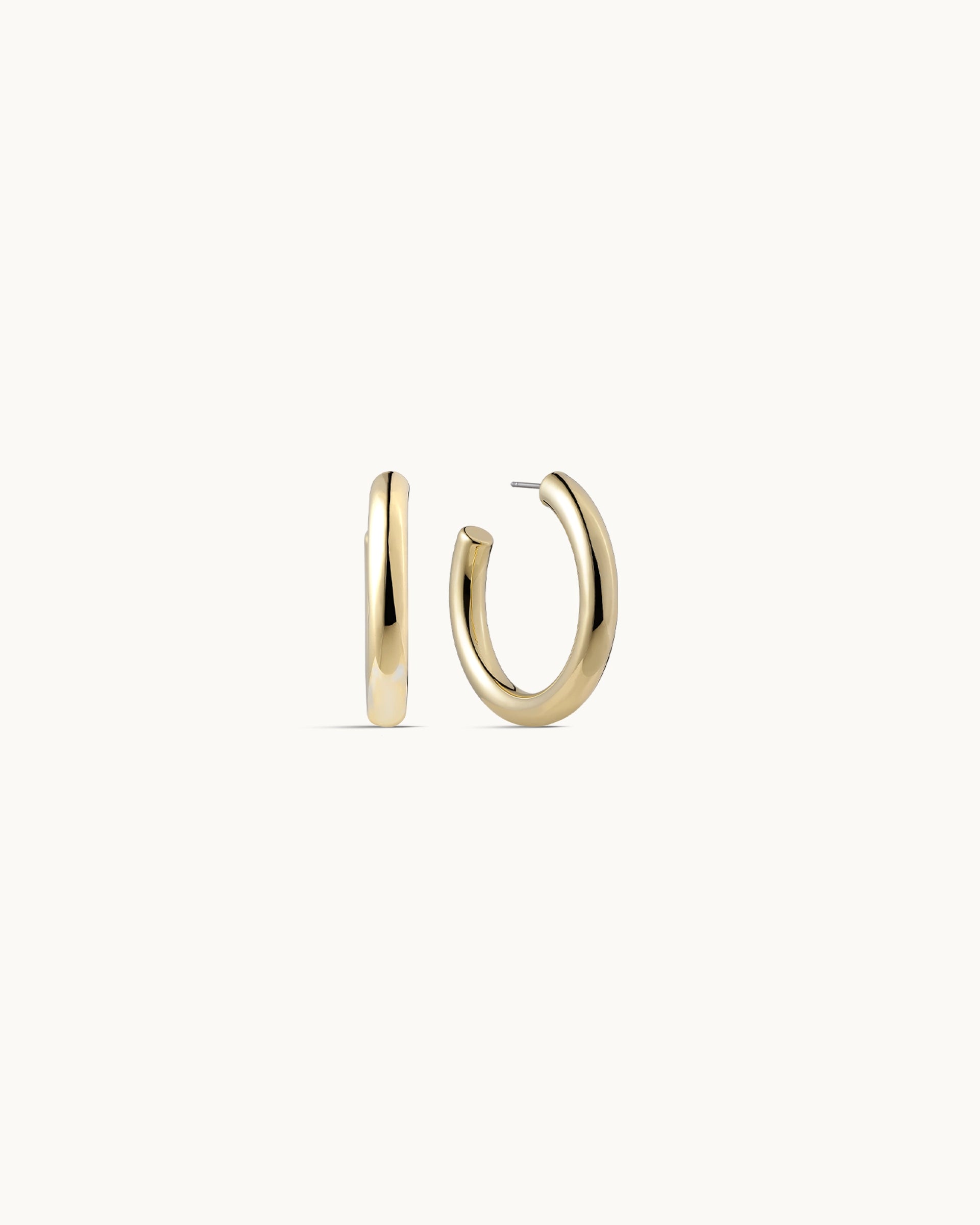 These hoop earrings feature a sleek, polished finish with a slightly thicker profile, giving them a bold yet timeless appeal. Their smooth, rounded shape creates a modern silhouette that’s effortlessly versatile, making them perfect for both everyday wear and elevated occasions.
