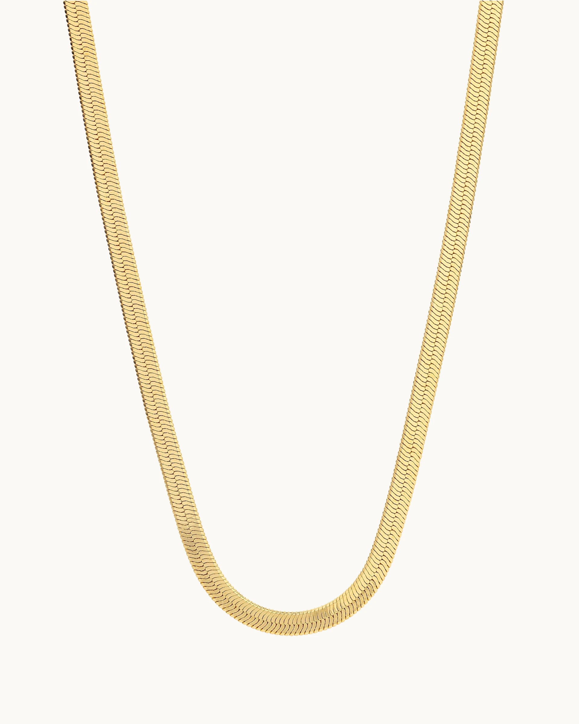 A timeless and versatile chain crafted with a sleek herringbone design that drapes smoothly along the neckline. Its fluid, reflective finish catches the light beautifully, adding a touch of modern sophistication to any look.