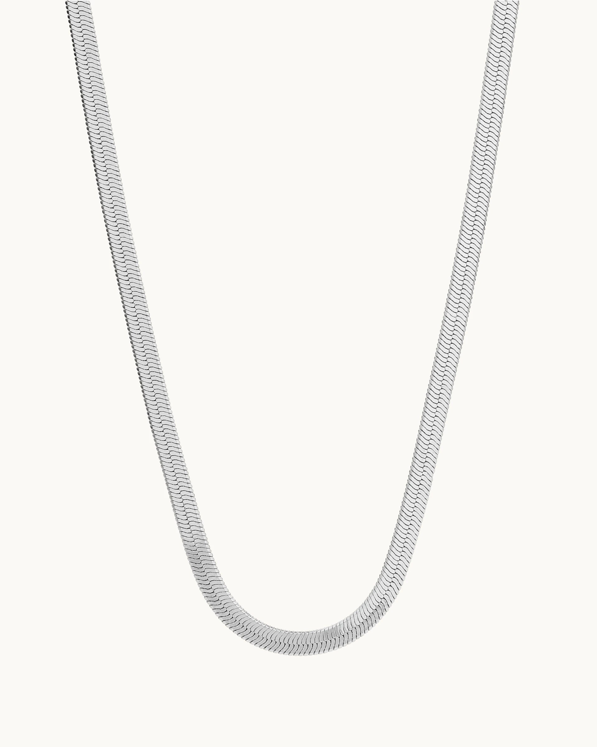 A timeless and versatile chain crafted with a sleek herringbone design that drapes smoothly along the neckline. Its fluid, reflective finish catches the light beautifully, adding a touch of modern sophistication to any look.