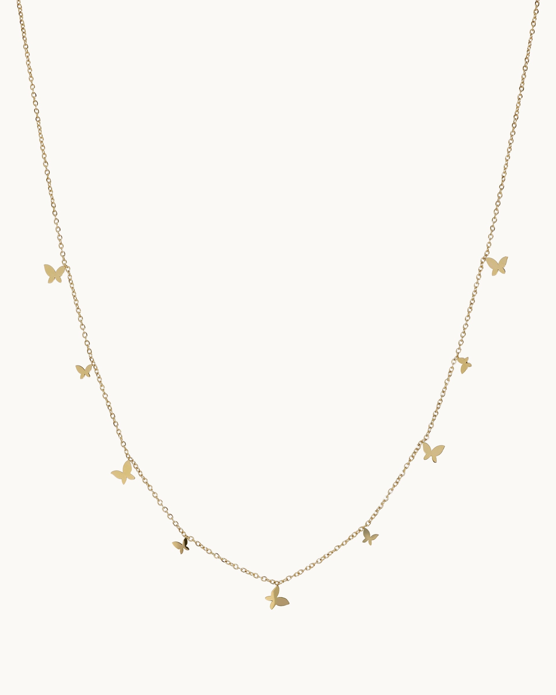 This necklace features a delicate row of tiny butterfly charms dancing along a fine gold chain, creating a soft, airy look that feels playful yet refined. The fluttering silhouettes add movement and charm, making it an easy piece to style on its own or layer with your everyday favorites.