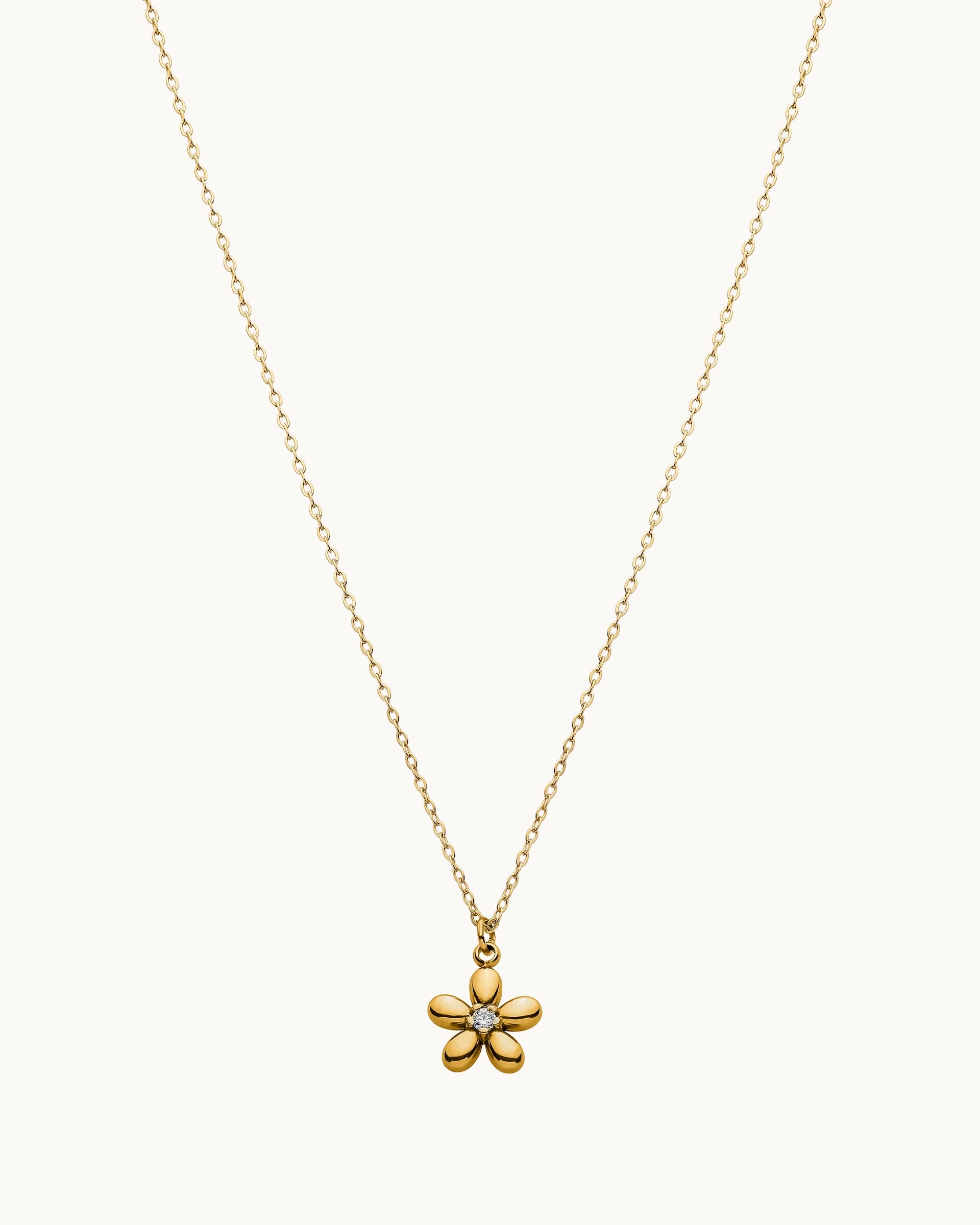 This necklace features a charming five-petal flower pendant accented with a subtle center stone that adds a delicate sparkle. Its softly rounded petals and polished silver finish give it a graceful, feminine appeal.