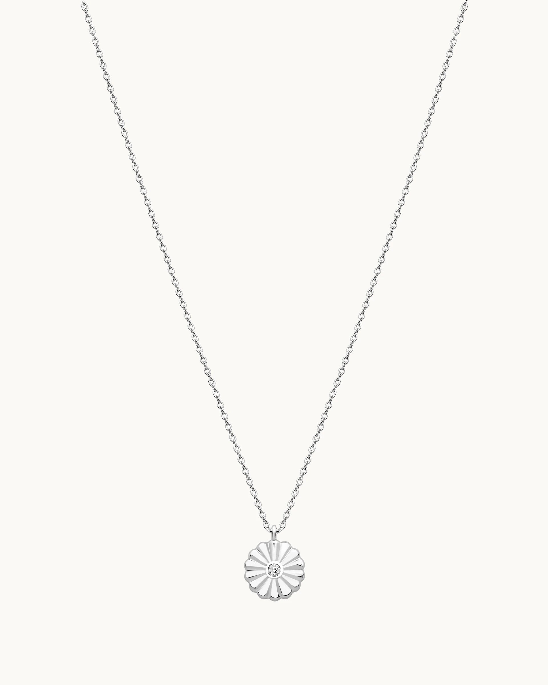 Timeless and refined, this necklace features a delicate floral-inspired pendant with softly sculpted petals radiating from a sparkling cubic zirconia centre. The polished silver-tone finish enhances its elegant silhouette, creating a subtle shimmer that catches the light beautifully.