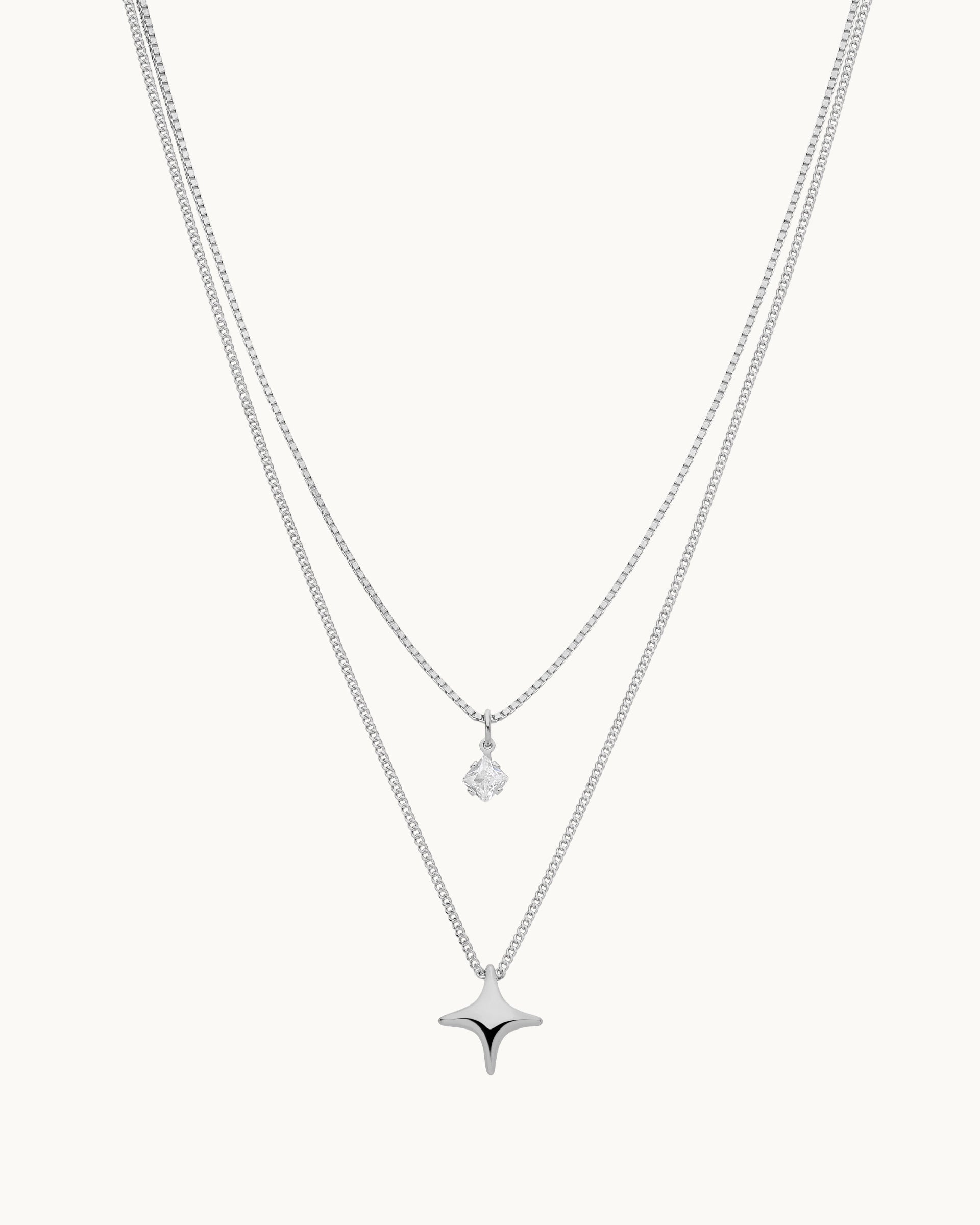 This layered necklace set features two fine chains accented with a delicate crystal detail and a sculptural star-inspired pendant for a modern, celestial look. Designed to add subtle sparkle and dimension, it’s an effortless piece that elevates everyday outfits while remaining refined enough for special occasions.