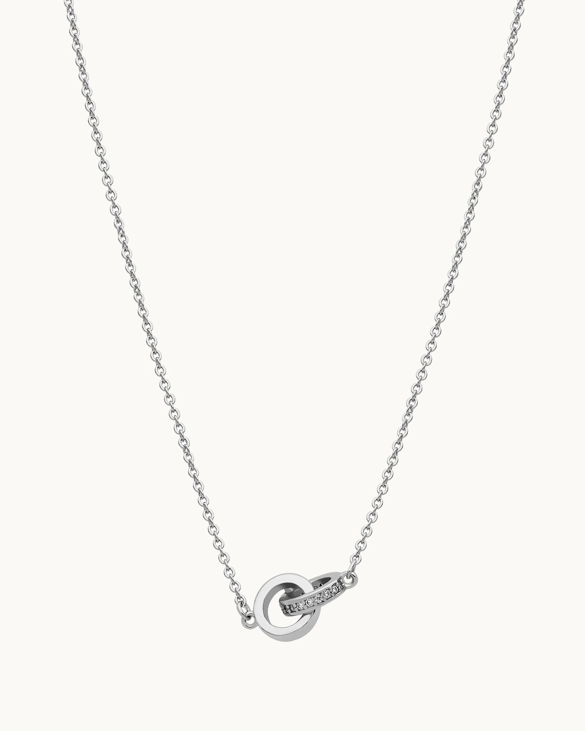 Modern and meaningful, this necklace features an interlocking circle pendant symbolising unity and connection. One sleek ring is accented with a row of sparkling cubic zirconia, adding a refined touch of brilliance to the minimalist silhouette. The clean, fluid design makes it both elegant and versatile for everyday wear.