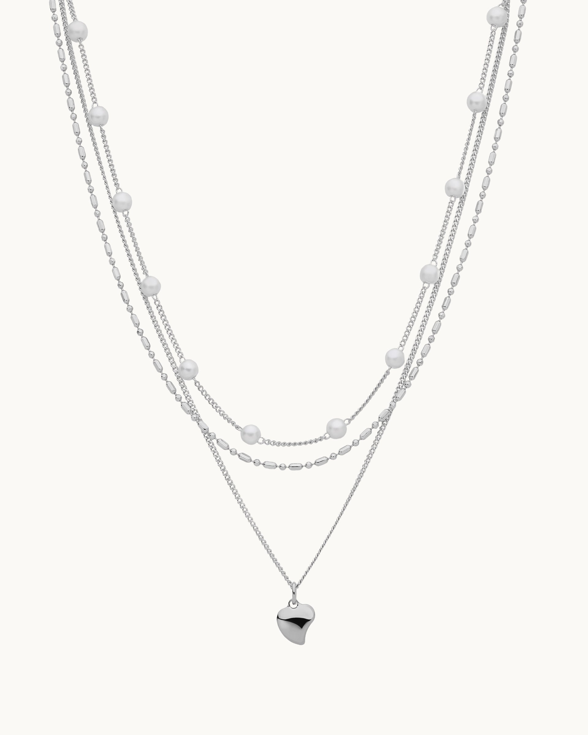 This layered set features a trio of delicate chains adorned with soft beaded accents and a polished heart pendant, creating a romantic and elevated look with beautiful texture and movement. Designed to be effortlessly wearable, it adds a charming touch to both everyday outfits and dressier moments.