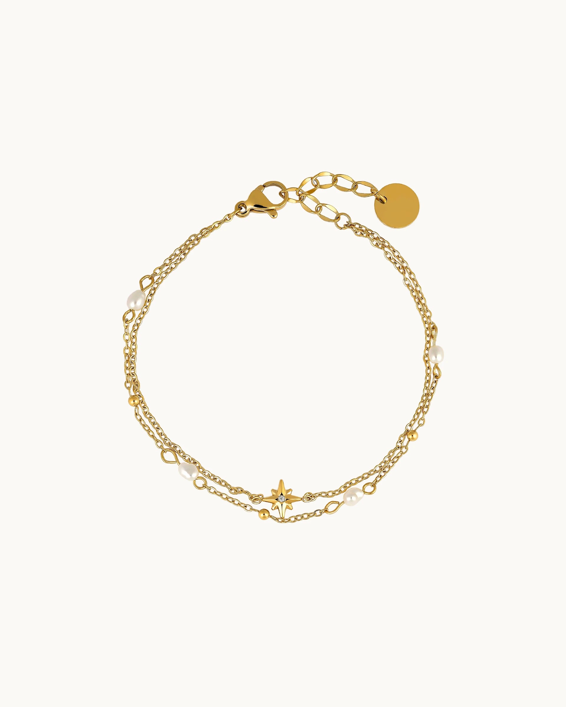 A modern and dimensional design, this bracelet features layered fine chains accented with small pearls, bead details, and a central star motif set with a touch of sparkle. The mixed elements create gentle movement and visual interest while maintaining an elegant silhouette.