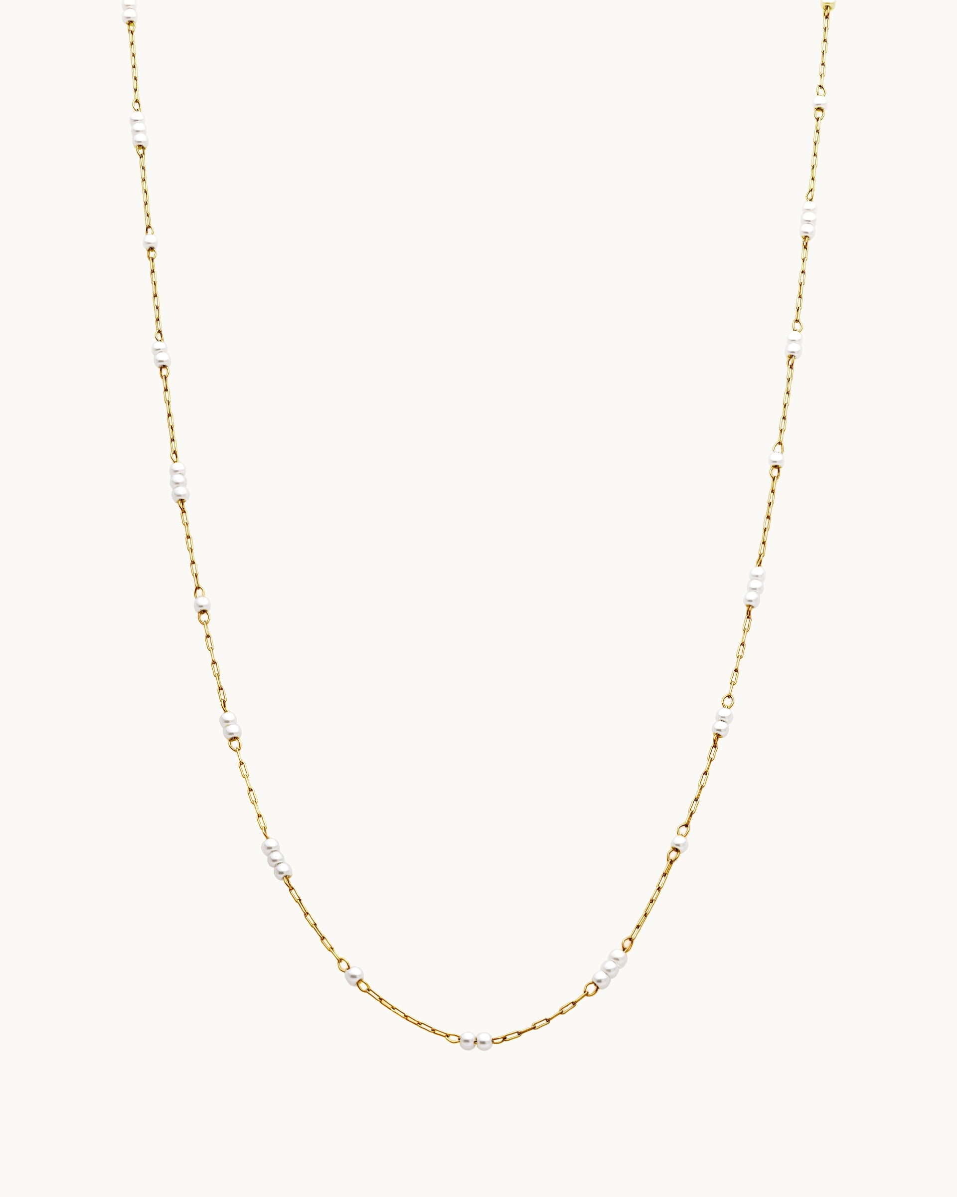 This necklace features a fine silver chain accented with small, lustrous beads spaced evenly throughout. Its minimalist and elegant design adds subtle sophistication, perfect for layering or wearing alone for a refined look.
