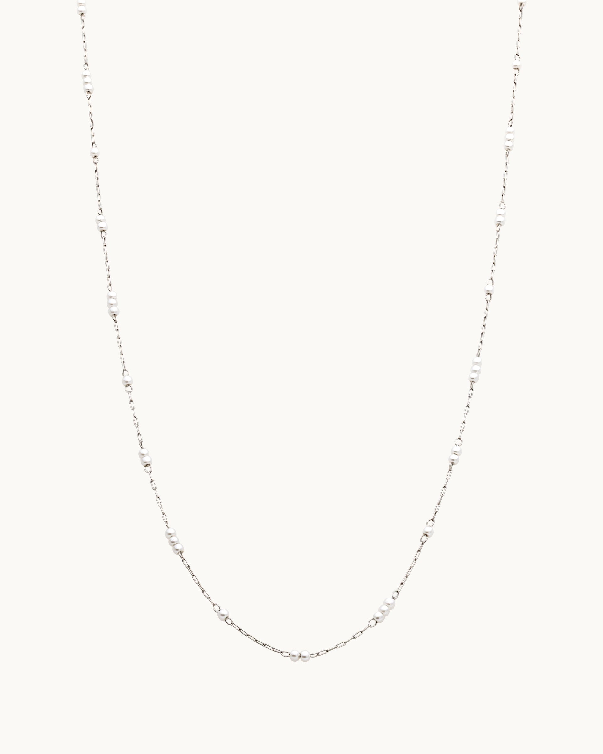 This necklace features a fine silver chain accented with small, lustrous beads spaced evenly throughout. Its minimalist and elegant design adds subtle sophistication, perfect for layering or wearing alone for a refined look.