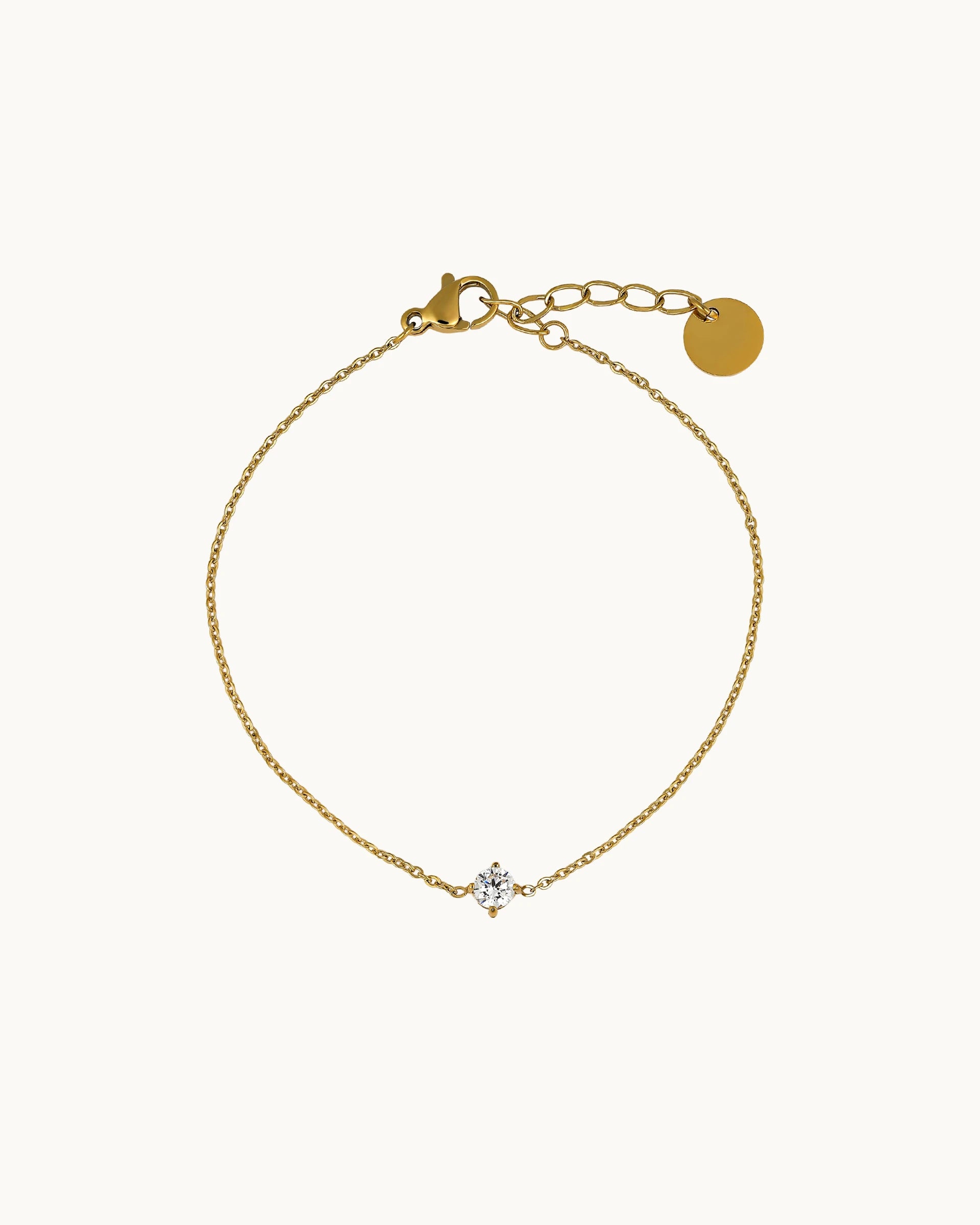 A classic solitaire design, this bracelet centres on a single prong-set cubic zirconia that offers brilliant sparkle against a fine, delicate chain. The timeless silhouette makes it a versatile staple for both layering and standalone wear.