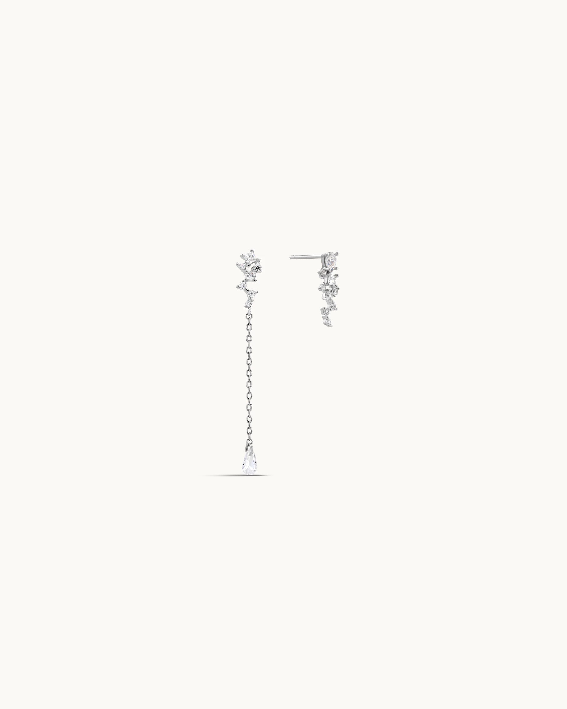A delicate and celestial-inspired design, these drop earrings feature a sparkling cubic zirconia cluster that cascades into a fine chain finished with a teardrop stone for graceful movement and brilliant shine. The asymmetrical silhouette adds a modern edge, creating an elegant statement with refined sparkle.
