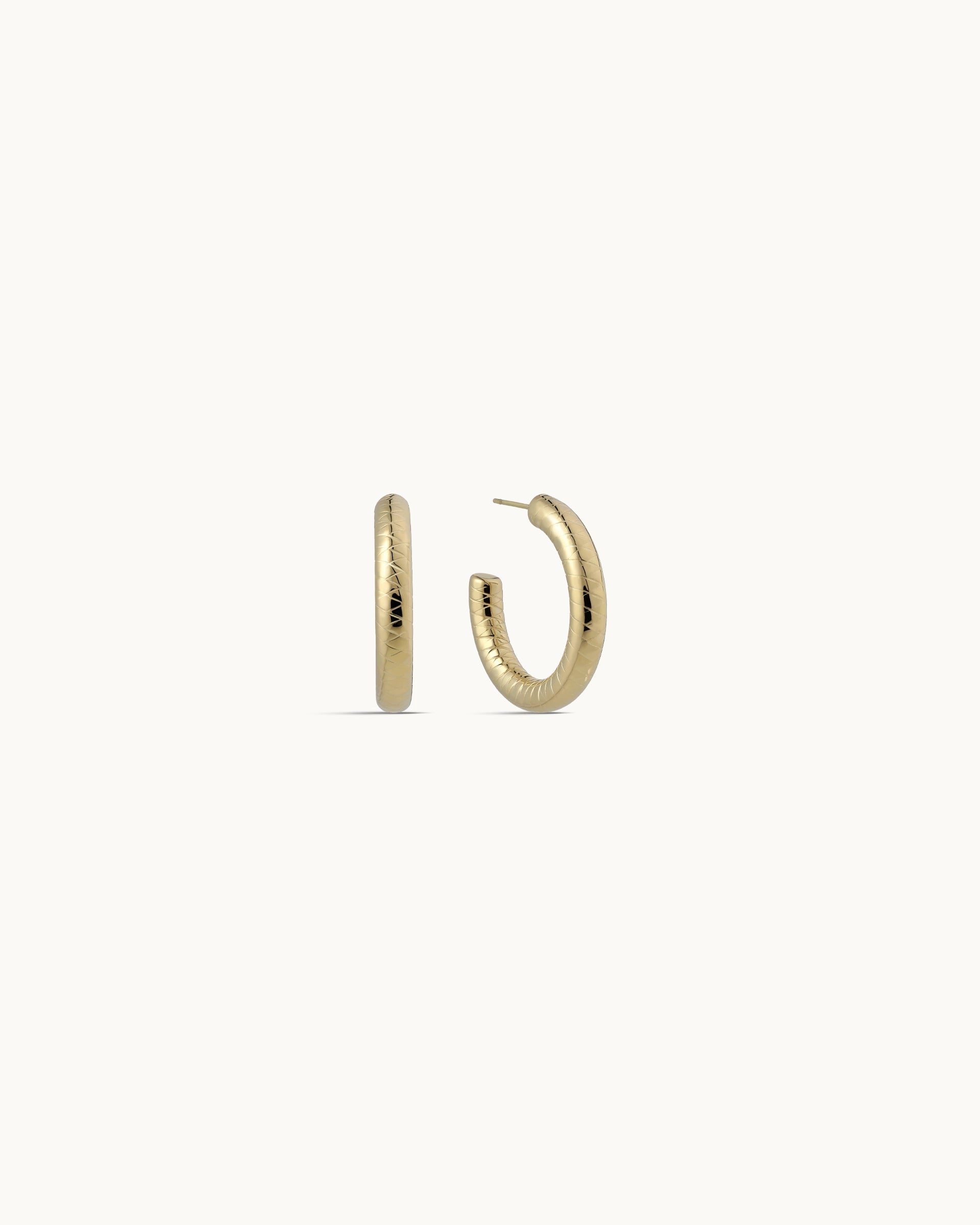 These earrings feature a polished hoop with subtle faceted detailing that catches the light from every angle. Their clean, modern shape adds a hint of texture while keeping the look effortlessly refined and easy to pair with anything.
