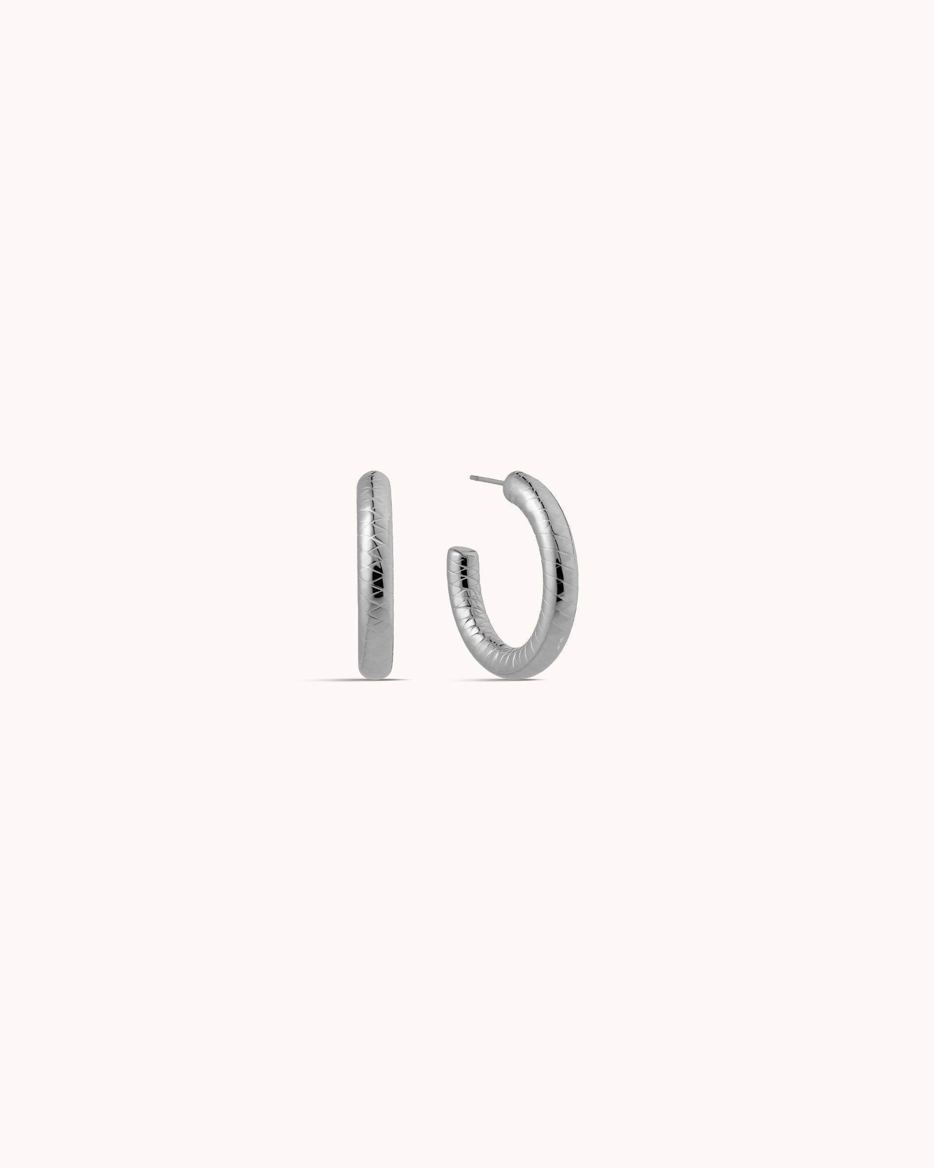 These earrings feature a polished hoop with subtle faceted detailing that catches the light from every angle. Their clean, modern shape adds a hint of texture while keeping the look effortlessly refined and easy to pair with anything.