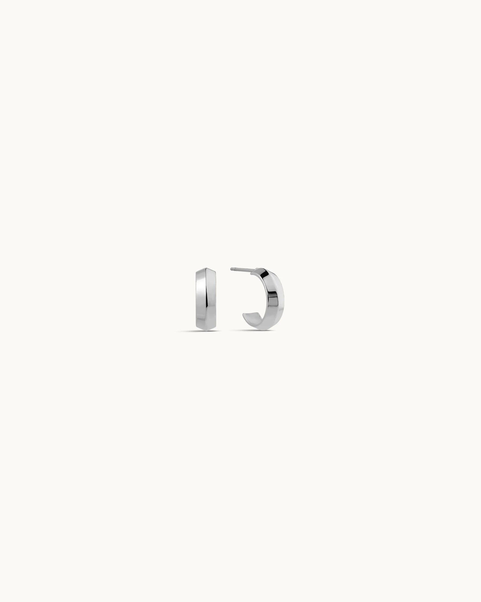 Hoop earring showcasing a sleek, curved silhouette that embodies modern minimalism. Its clean lines and smooth, reflective surface create a timeless and versatile look suitable for any occasion.