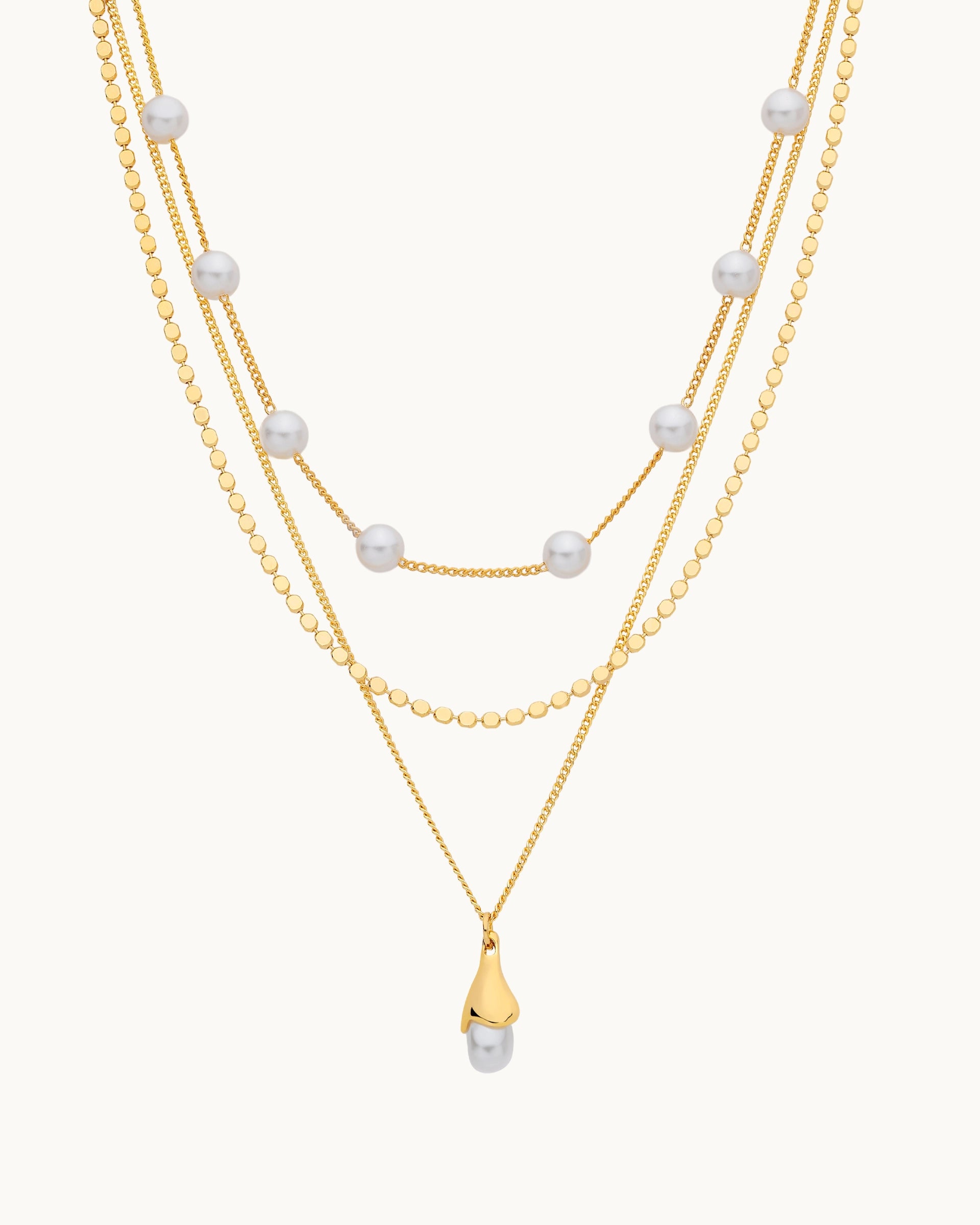 The pearl chain is a separate necklace, while the other two chains are joined together, giving you the freedom to style them as a full layered set or wear each piece on its own.
