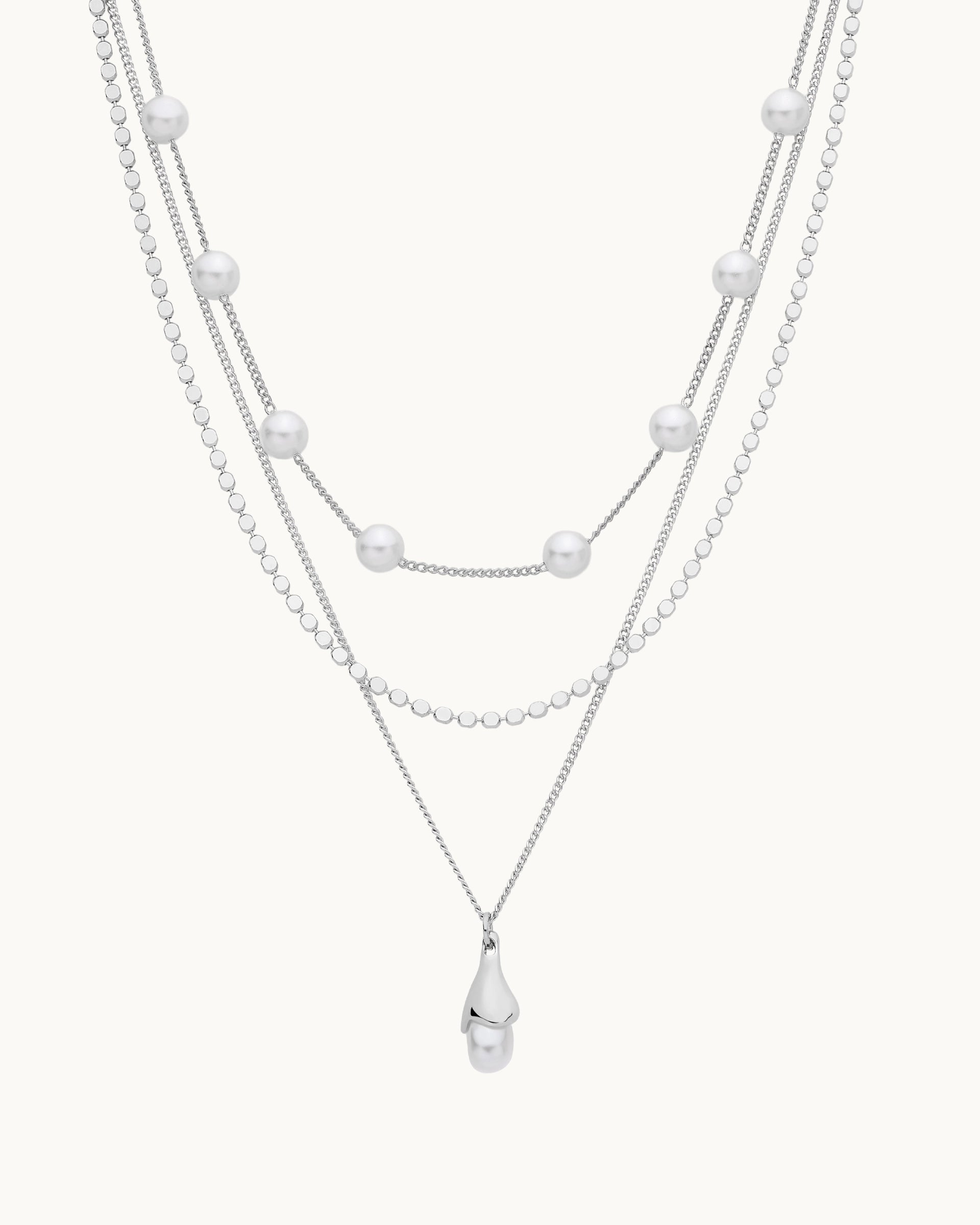 The pearl chain is a separate necklace, while the other two chains are joined together, giving you the freedom to style them as a full layered set or wear each piece on its own.
