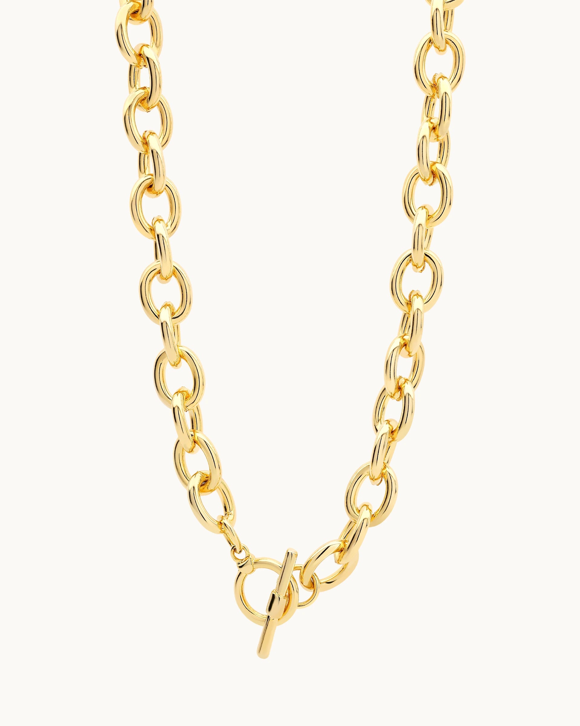 A bold and versatile chain designed with oversized interlocking links and a statement toggle clasp. Its polished finish adds a touch of modern sophistication, making it the perfect accessory to elevate both casual and dressy looks.