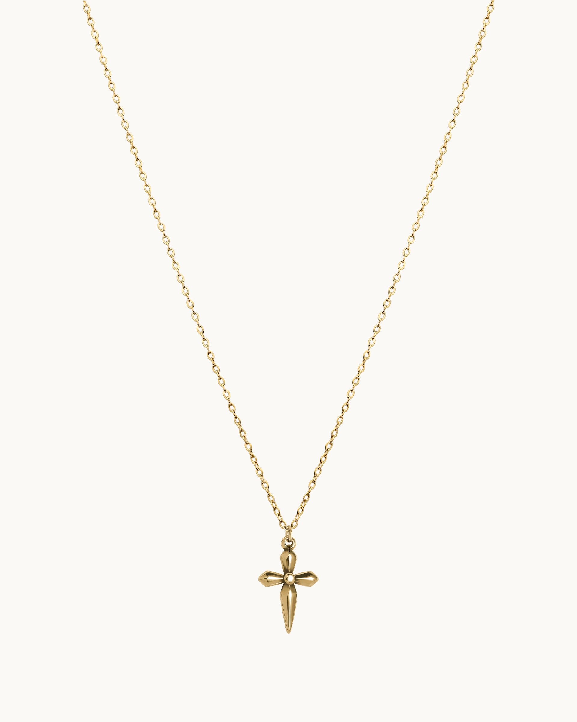 This necklace features a sleek fine chain paired with a sculptural cross pendant, creating a refined silhouette with a subtle edge. The elongated design adds a modern touch while keeping the look clean and understated, making it easy to wear on its own or layered with other favourites.