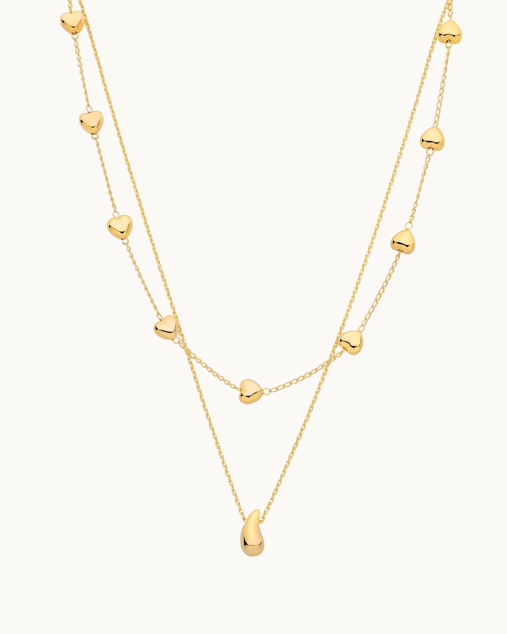 This layered necklace set features a playful mix of heart accents and a sculptural drop pendant for a romantic yet modern look. The combination of delicate detailing and soft movement adds dimension, making it easy to dress up everyday outfits or complement special occasions.