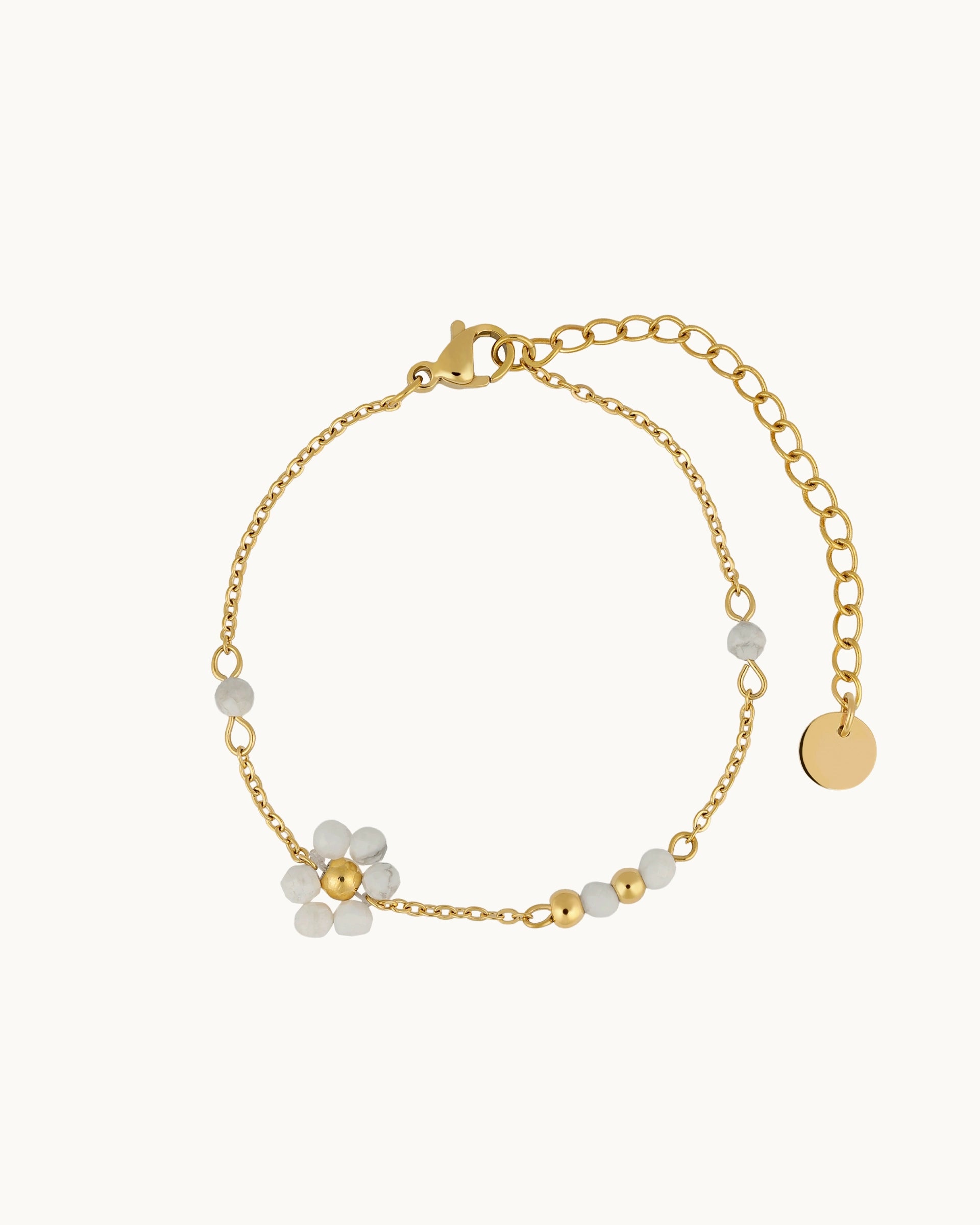 This bracelet features a delicate arrangement of beads with a charming floral accent at the center, adding a playful yet refined touch to your everyday style. Its lightweight design makes it perfect for stacking or wearing solo for a subtle pop of detail.