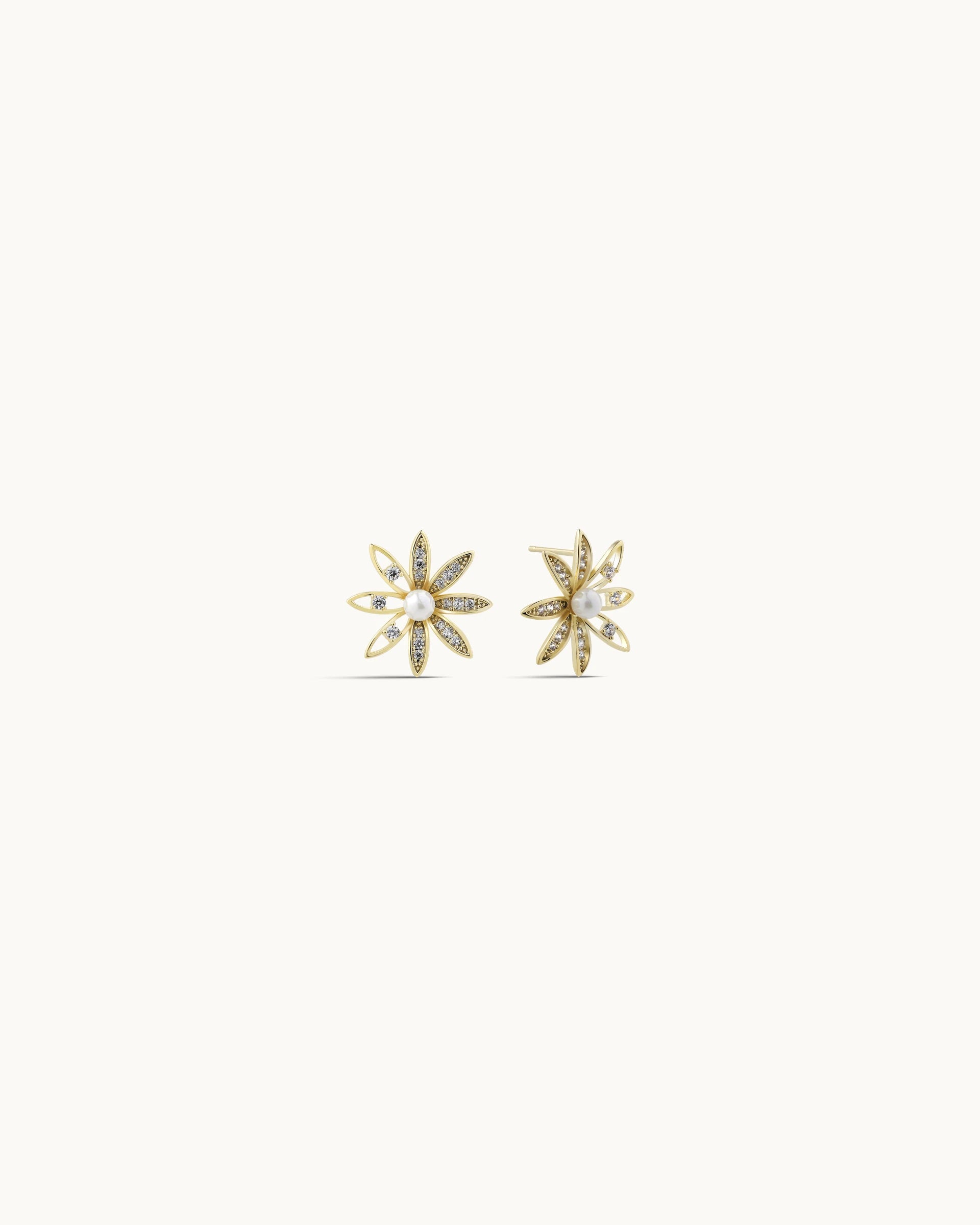 A radiant and feminine design, these stud earrings feature an intricate starburst silhouette with alternating open gold petals and pavé cubic zirconia details, centred with a luminous pearl. The layered construction creates depth and brilliance, offering a refined balance of sparkle and softness.