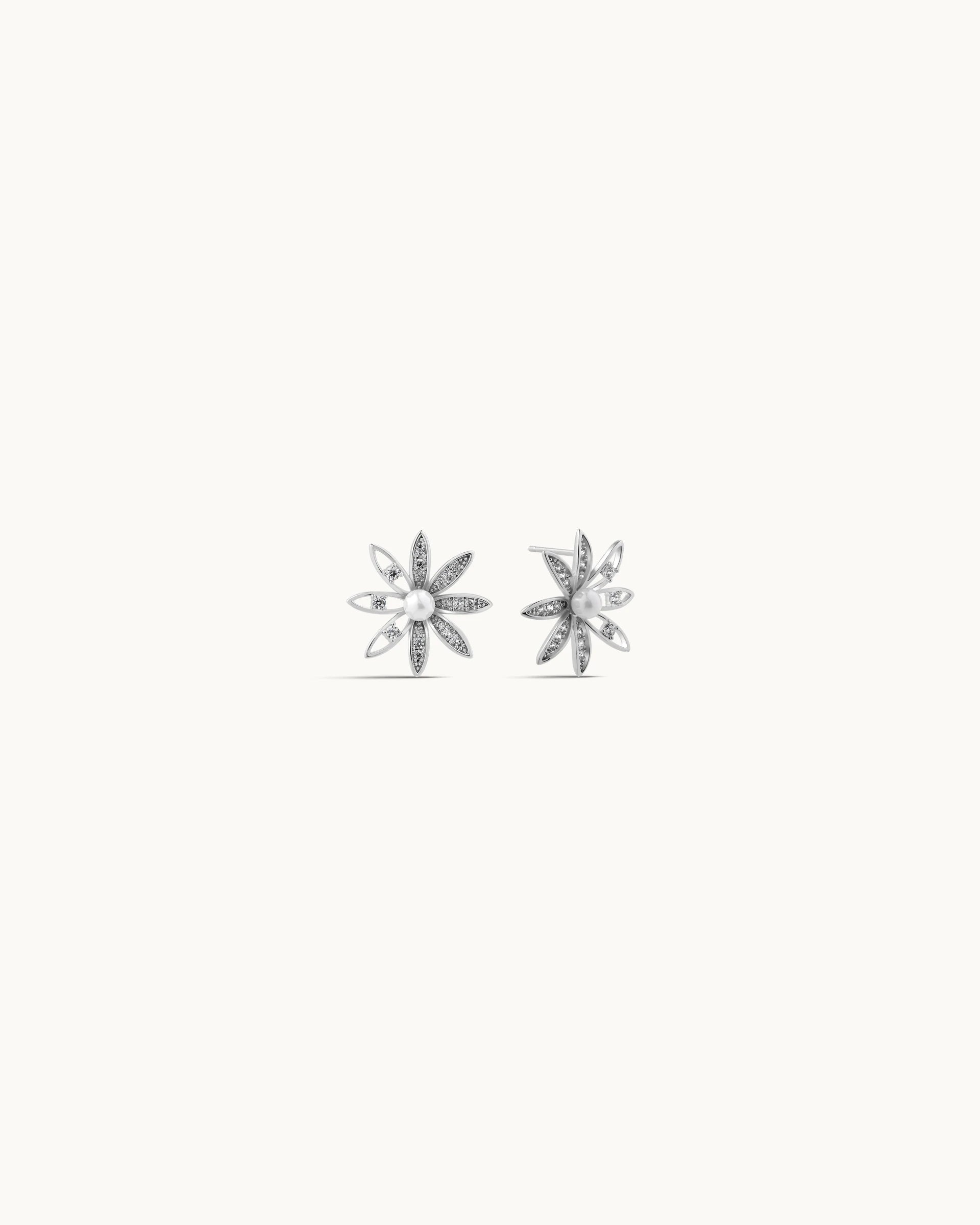 A radiant and feminine design, these stud earrings feature an intricate starburst silhouette with alternating open gold petals and pavé cubic zirconia details, centred with a luminous pearl. The layered construction creates depth and brilliance, offering a refined balance of sparkle and softness.