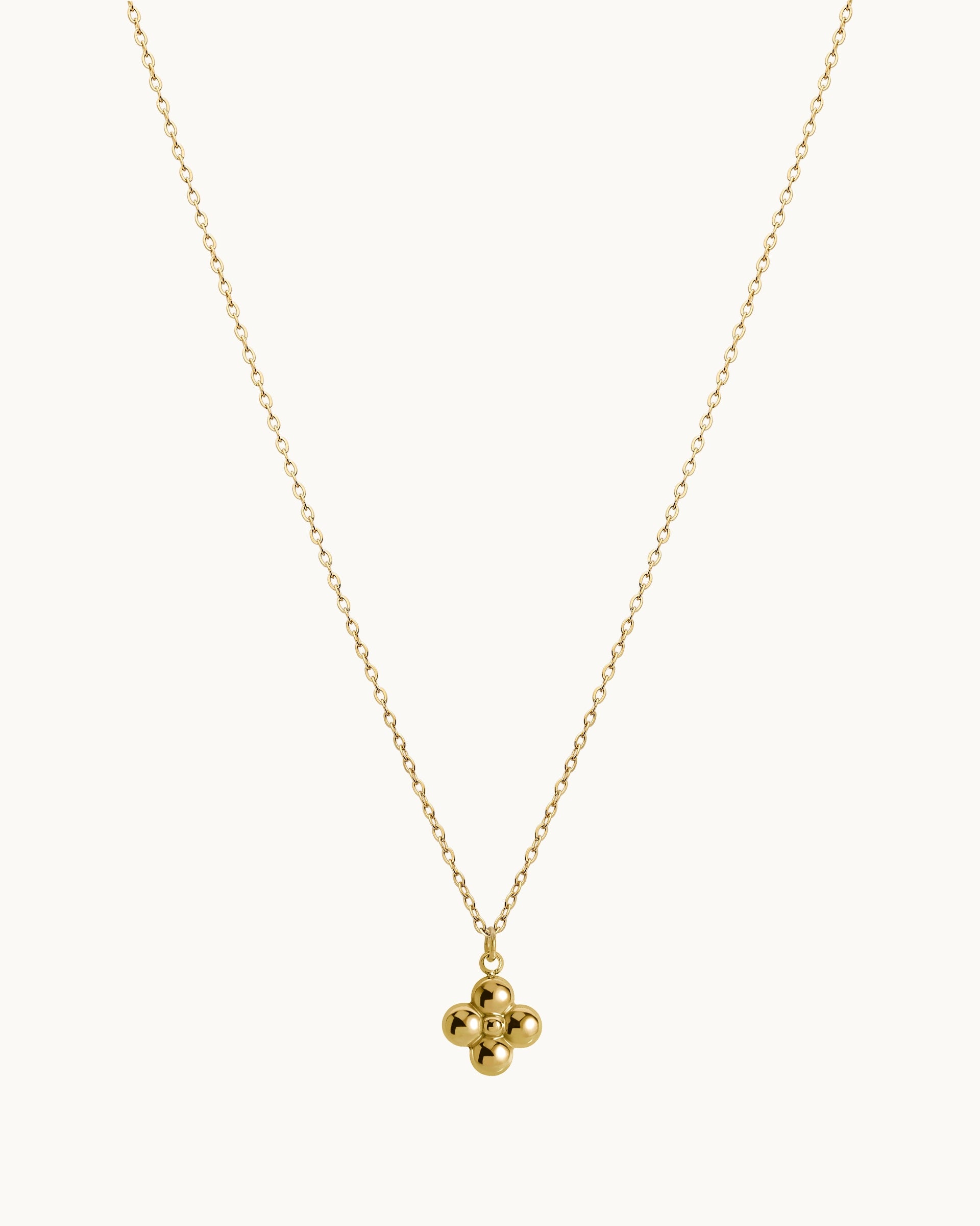 This necklace features a polished clover-inspired pendant formed by smooth rounded spheres, creating a soft, sculptural look with a touch of playful charm. Suspended from a fine gold chain, it adds a subtle shine that feels refined and easy to style for everyday wear.