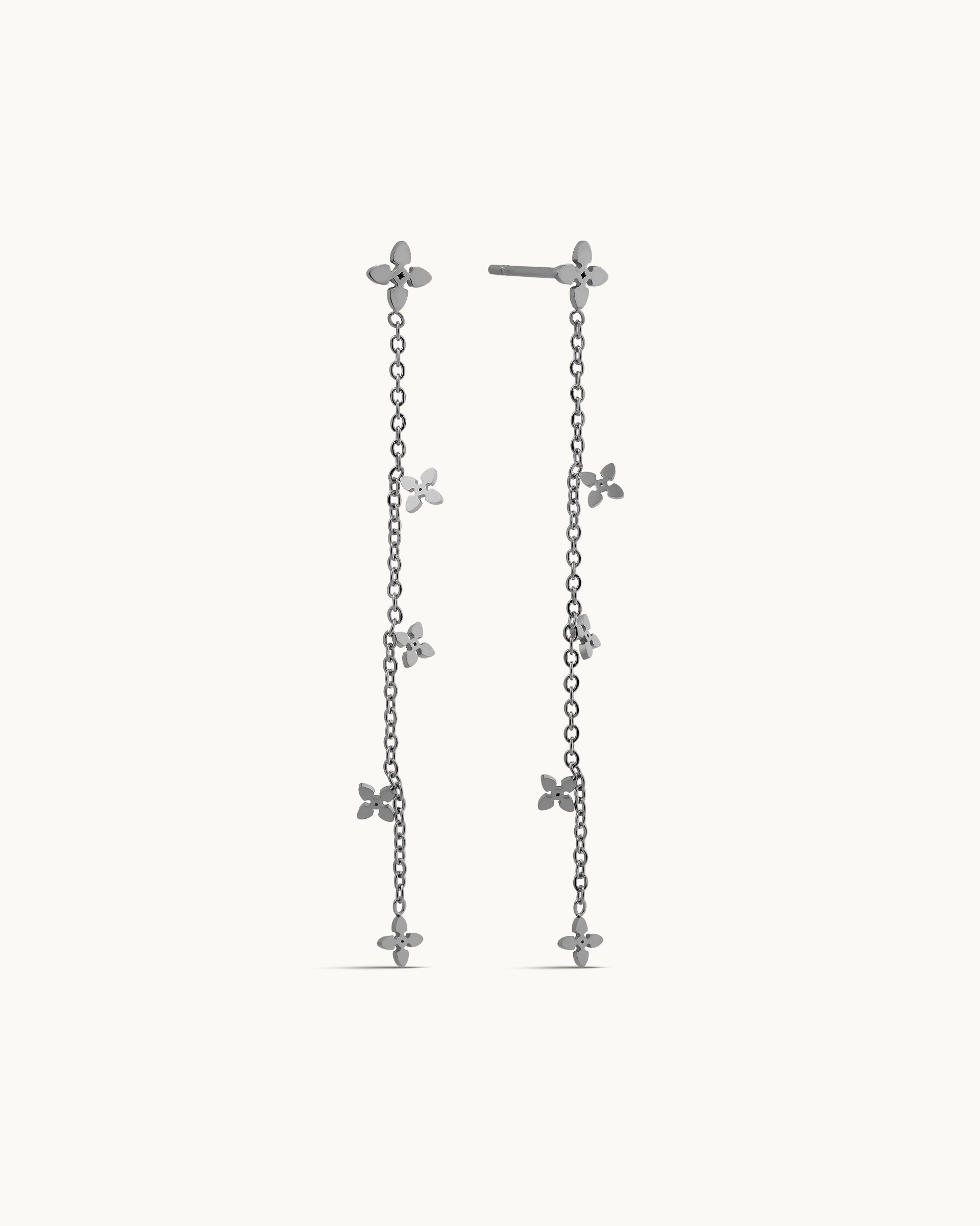 These earrings feature a delicate cascade of tiny gold floral motifs that dance softly along a slender chain, creating a light, airy movement. Their whimsical, feminine design adds a touch of charm and shine, making them perfect for both everyday wear and special occasions.