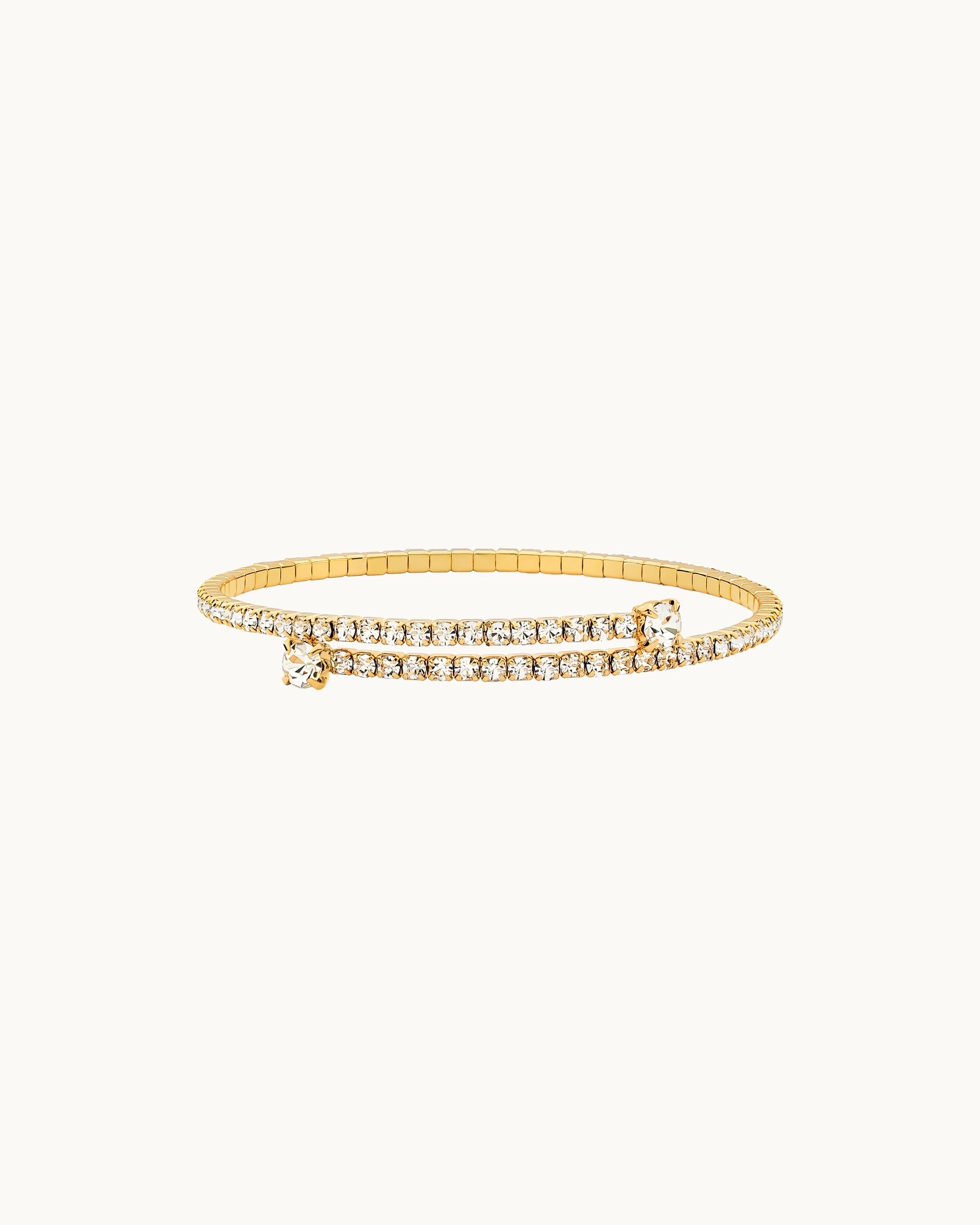 Sophisticated and sparkling, this front-opening bangle is designed with a flexible fit for easy wear. It features a double row of dazzling stones, finished with brilliant accents at the ends for an elegant touch.