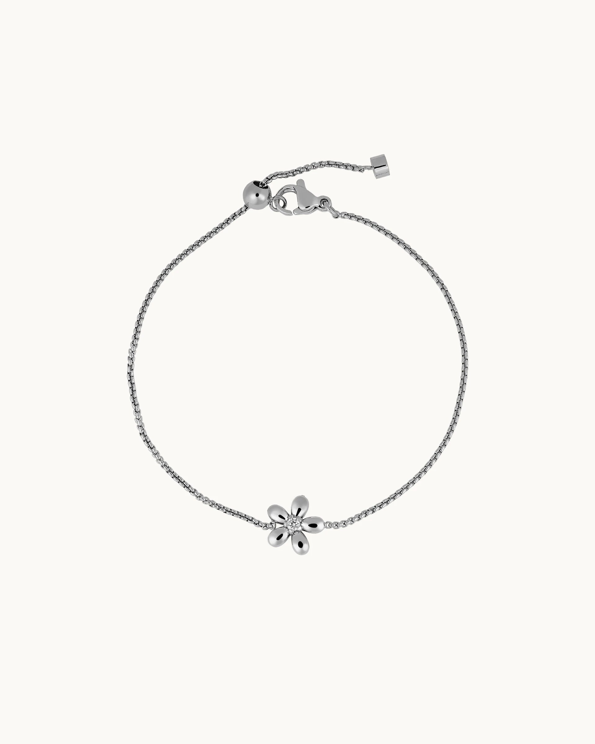 A delicate and charming design, this bracelet features a fine chain centred with a sculpted floral motif, accented by a single sparkling cubic zirconia for subtle brilliance. The softly contoured petals create a refined silhouette that feels elegant yet effortlessly wearable.