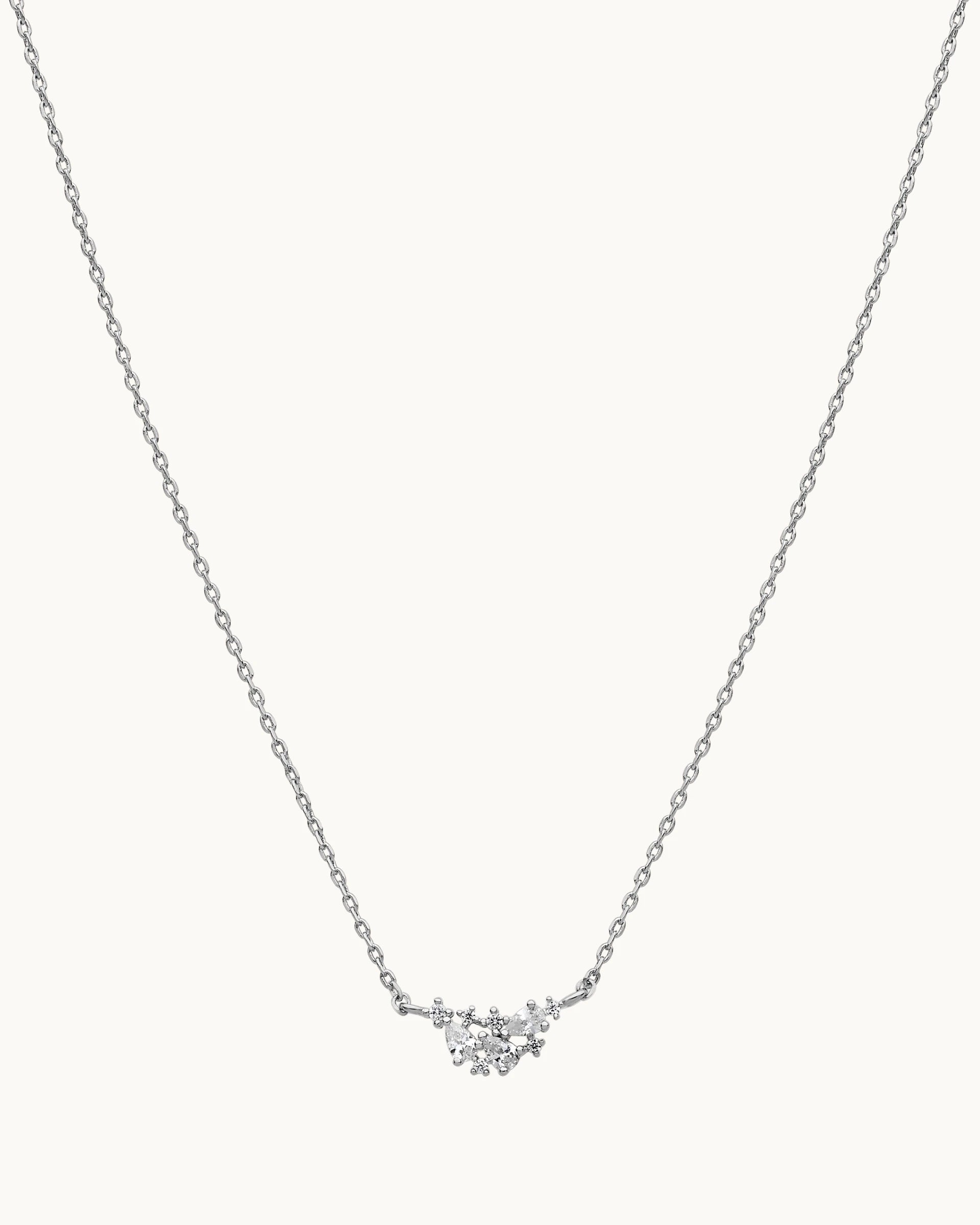 Delicate yet eye-catching, this necklace features a sparkling cluster pendant set with brilliant cubic zirconia stones in mixed cuts for added dimension and shine. The carefully arranged stones create a soft, organic silhouette that catches the light beautifully from every angle.