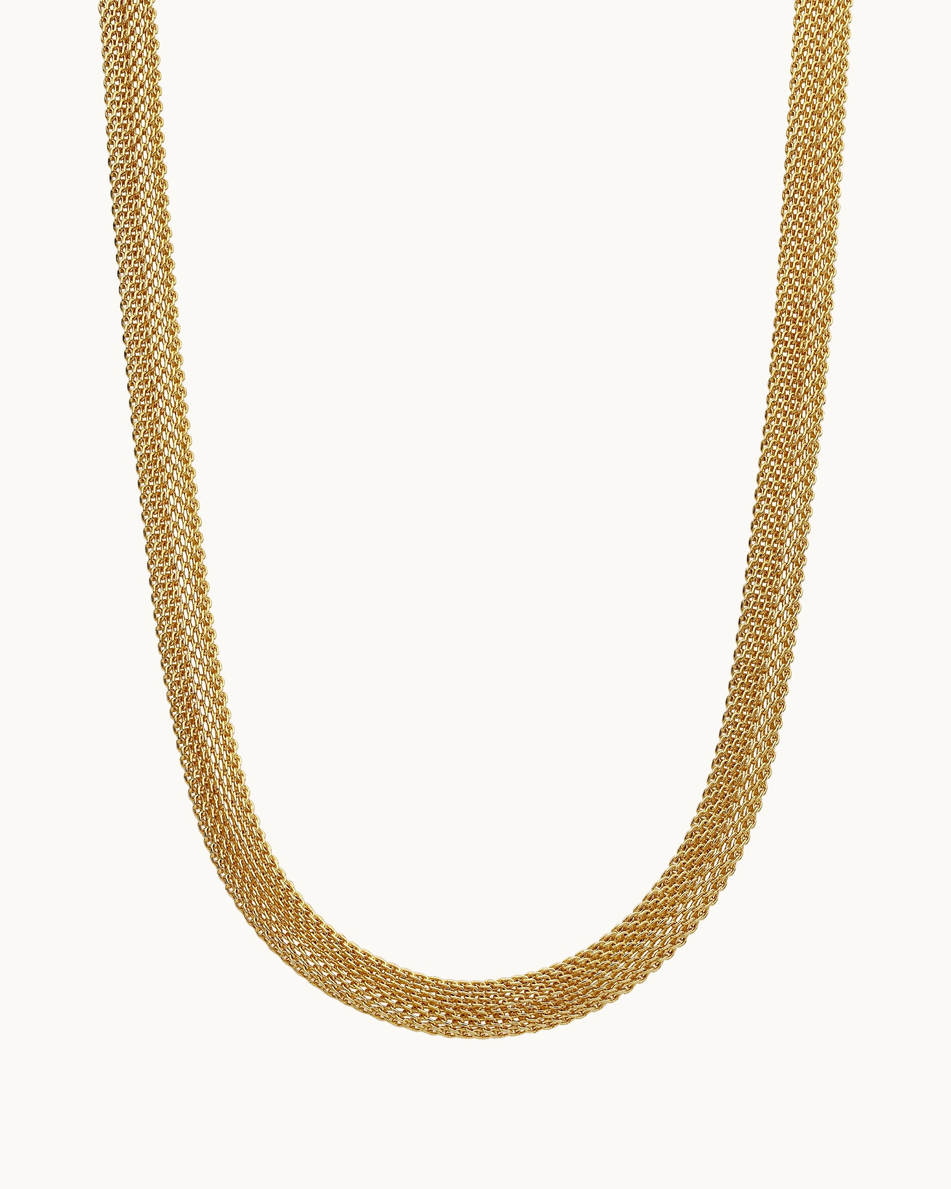 Sophisticated and statement-making, this necklace features a beautifully woven multi-strand chain that creates a rich, textured look. The tightly layered links form a fluid, mesh-like silhouette that sits elegantly along the neckline, offering both shine and dimension.