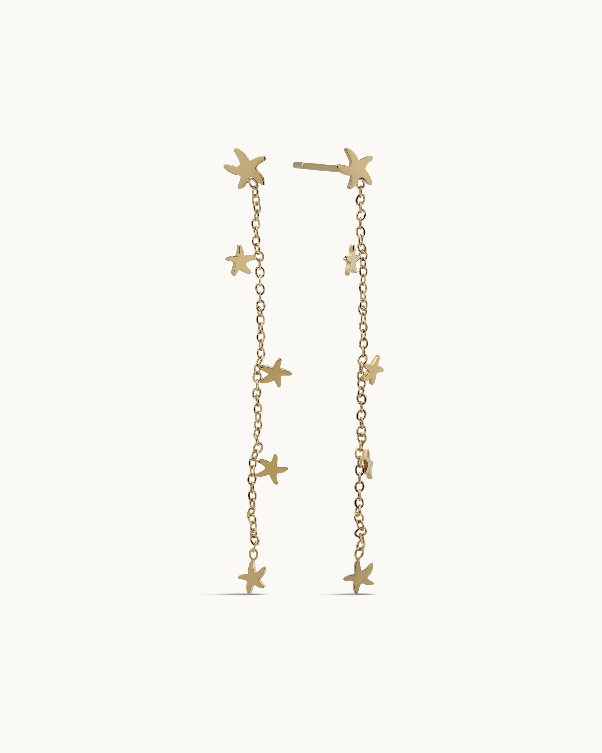 These earrings feature a playful trail of tiny gold starfish that sway gently along a slim dangling chain, adding a soft touch of movement and shine. Their whimsical, beach-inspired design brings a light and effortless charm to any look, perfect for sunny days or everyday styling.