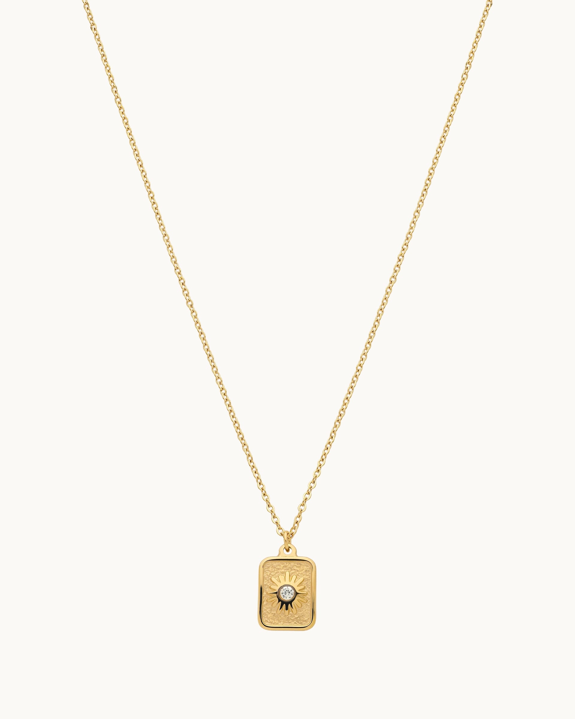This necklace features a rectangular pendant engraved with soft sunburst detailing and a single polished accent at the centre, creating a refined yet expressive touch. Its clean, minimal silhouette makes it easy to style, adding a subtle hint of shine to any look.