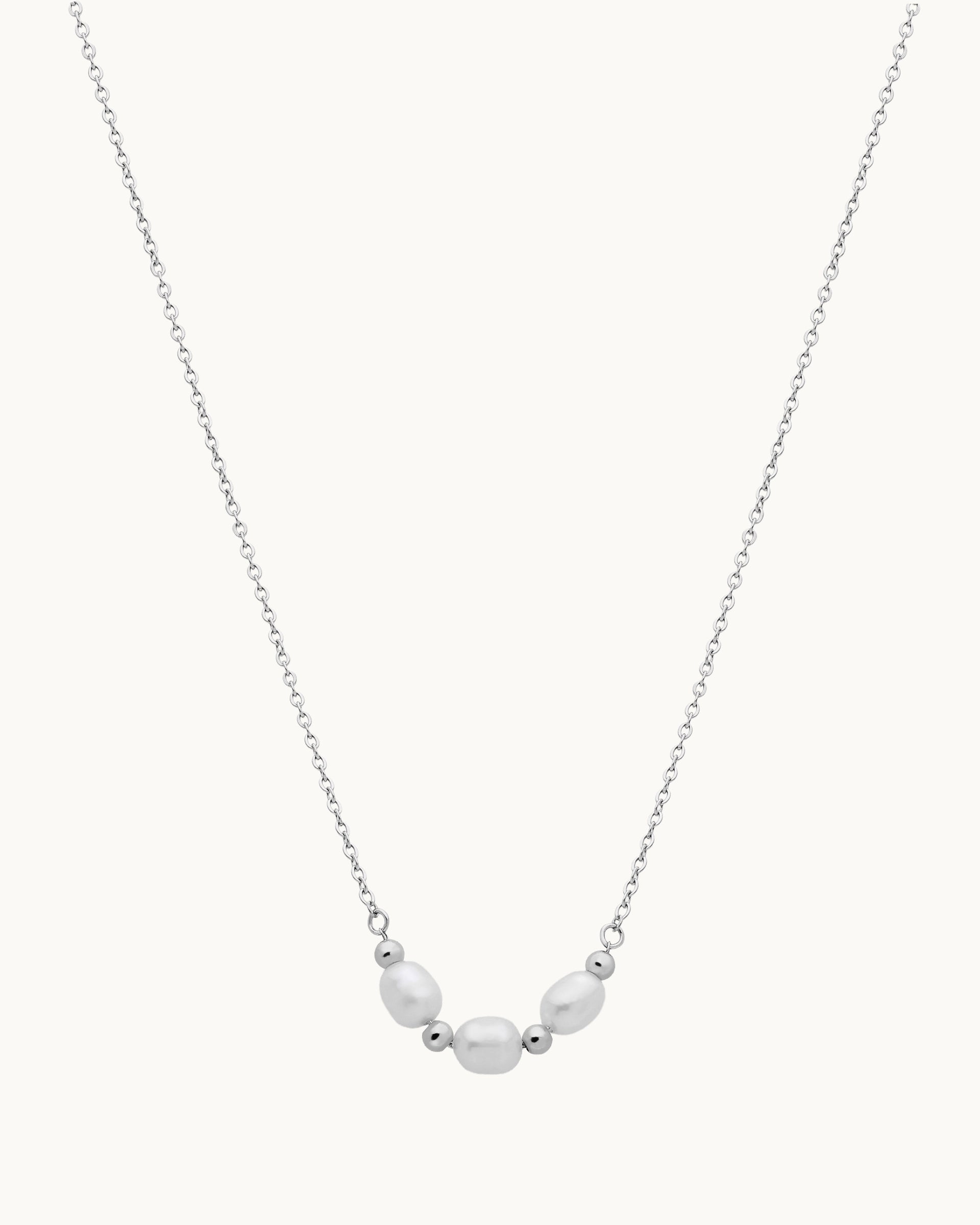 This necklace showcases a row of freshwater pearls, spaced with petite metal beads to create a soft, graceful curve along the neckline. Its clean, minimal design brings a touch of elegance to any look, making it an easy everyday favourite or a refined layering piece.