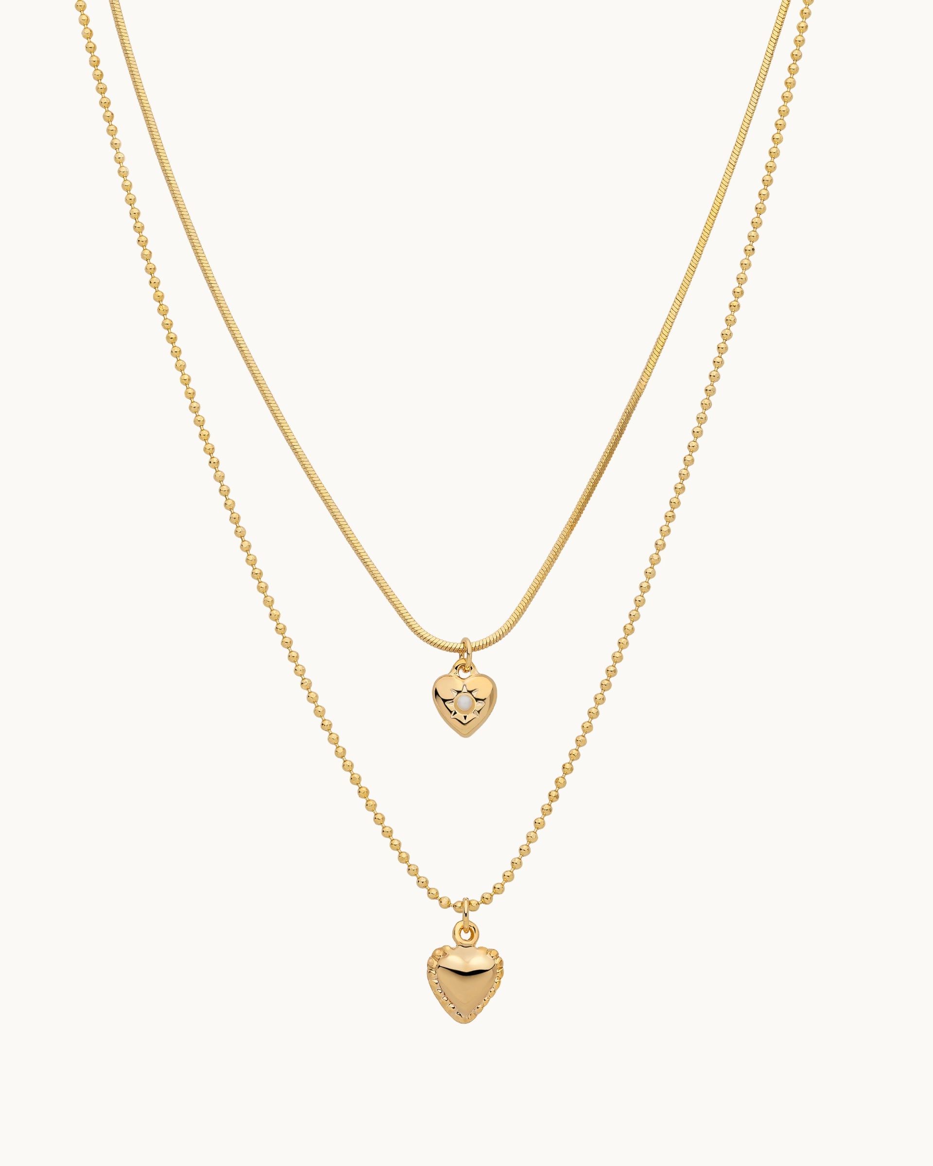 This layered heart necklace set combines delicate chain textures with polished heart pendants for a timeless, romantic look. Designed to add subtle dimension and elegance, it’s perfect for everyday wear and special occasions alike.