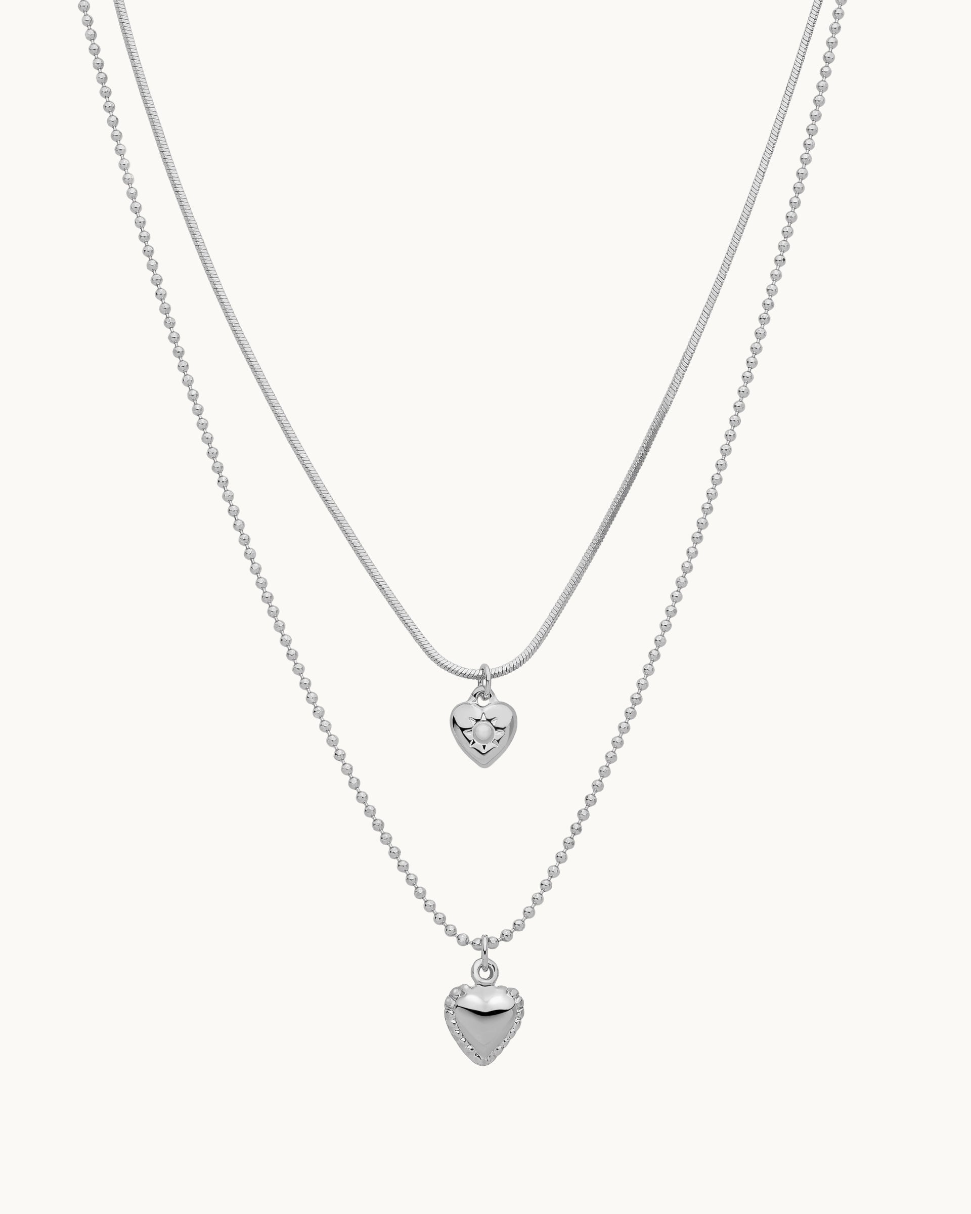 This layered heart necklace set combines delicate chain textures with polished heart pendants for a timeless, romantic look. Designed to add subtle dimension and elegance, it’s perfect for everyday wear and special occasions alike.