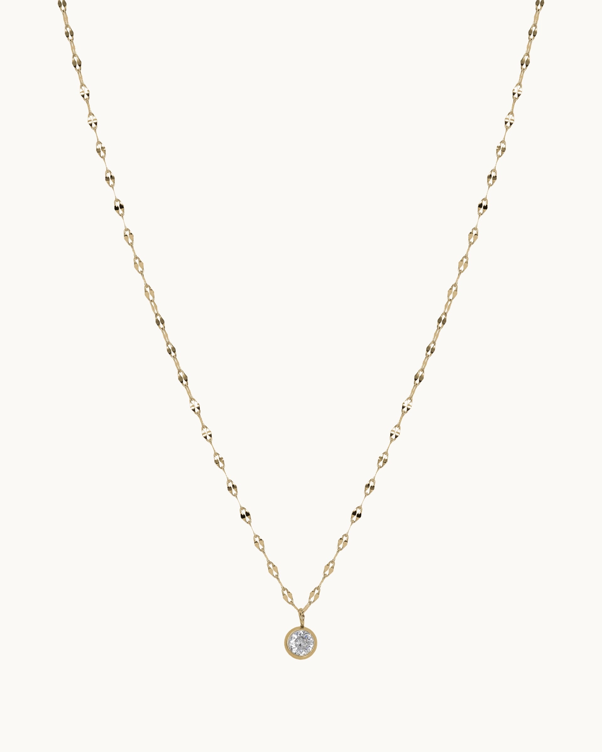 This necklace features a delicate round pendant set with a single sparkling stone, creating a clean and timeless look that catches the light with every movement. The subtly faceted chain adds an extra touch of shine, giving the piece an elegant yet effortless feel.