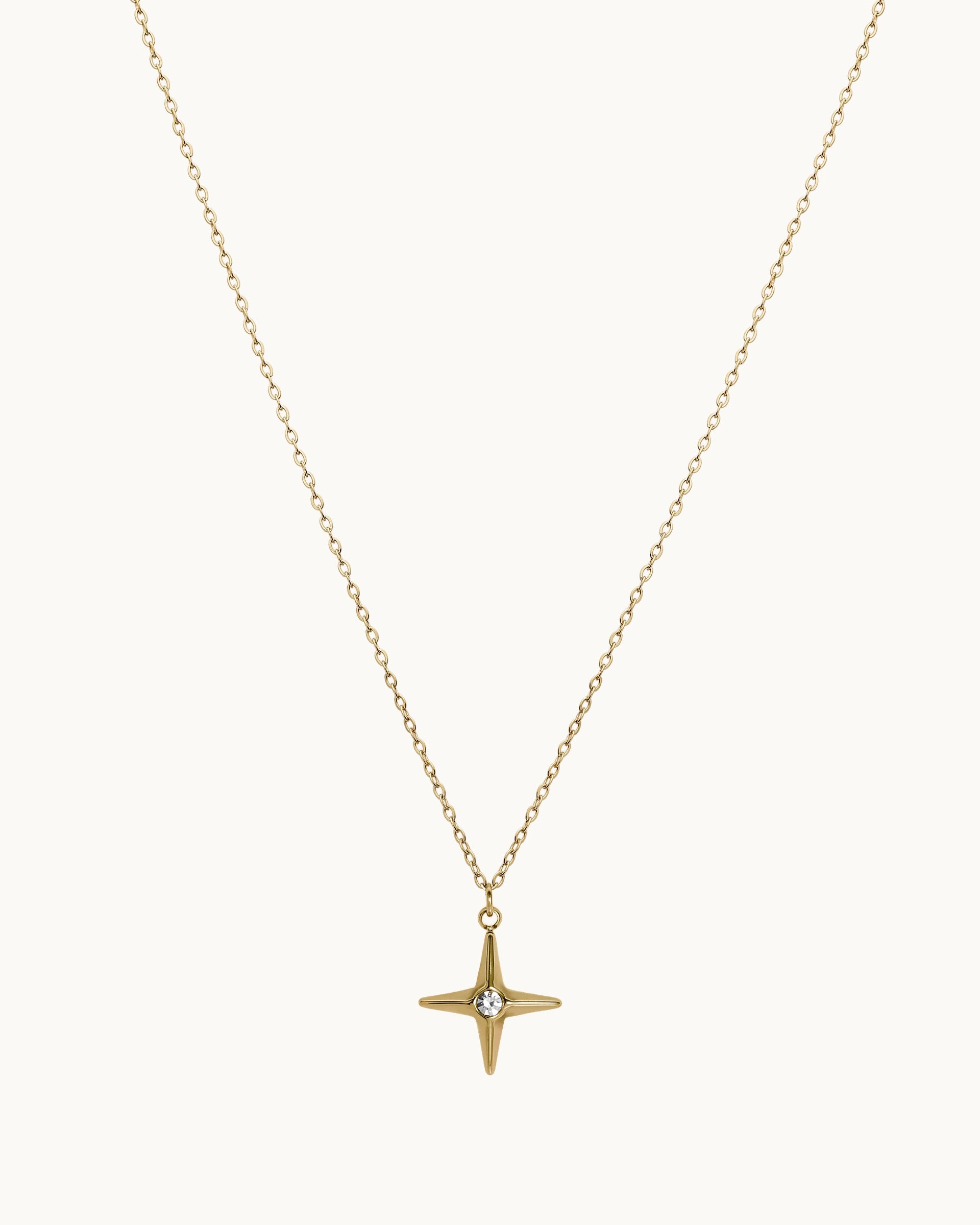 This necklace features a sleek four-point star pendant accented with a single sparkling stone, creating a clean and modern look with a touch of celestial charm. Its smooth lines and polished finish give it an effortlessly refined feel that pairs beautifully with any neckline.