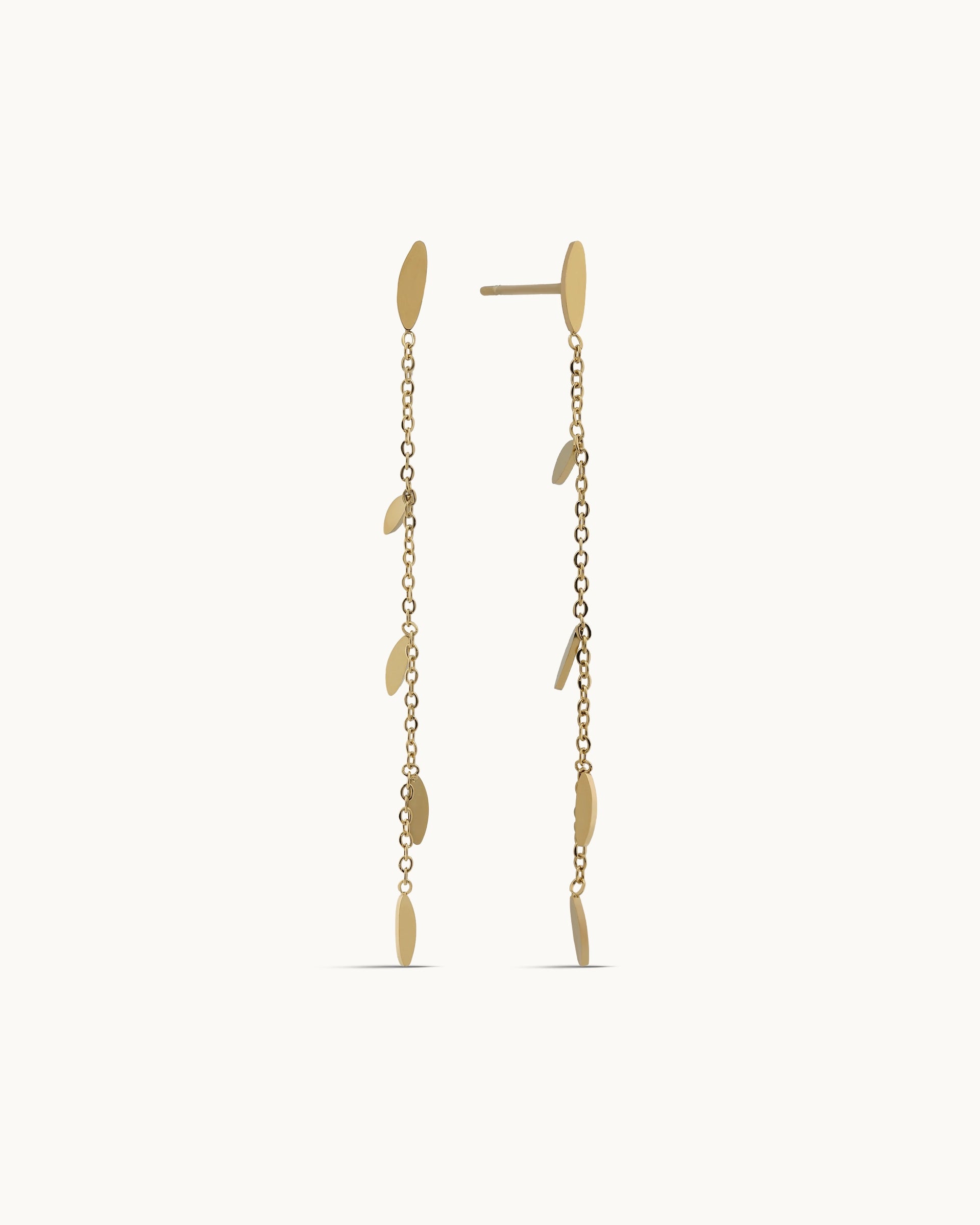 These earrings showcase a delicate cascade of tiny gold droplets that move softly with every step, offering an airy, graceful look. The slim, dangling silhouette adds subtle shimmer and elongation, perfect for elevating both casual and dressy styles with a touch of elegance.