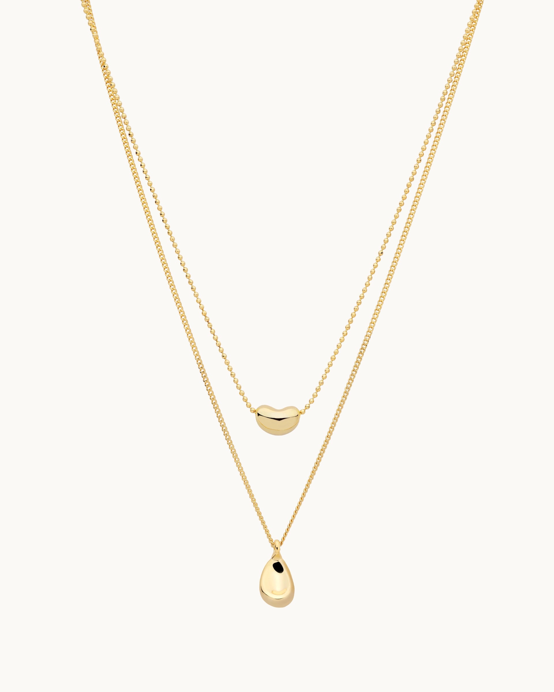 This layered necklace set features two fine chains accented with smooth, sculptural pendants for a clean, modern look. Designed with soft curves and subtle movement, it adds understated elegance to everyday outfits while remaining effortlessly refined for special occasions.