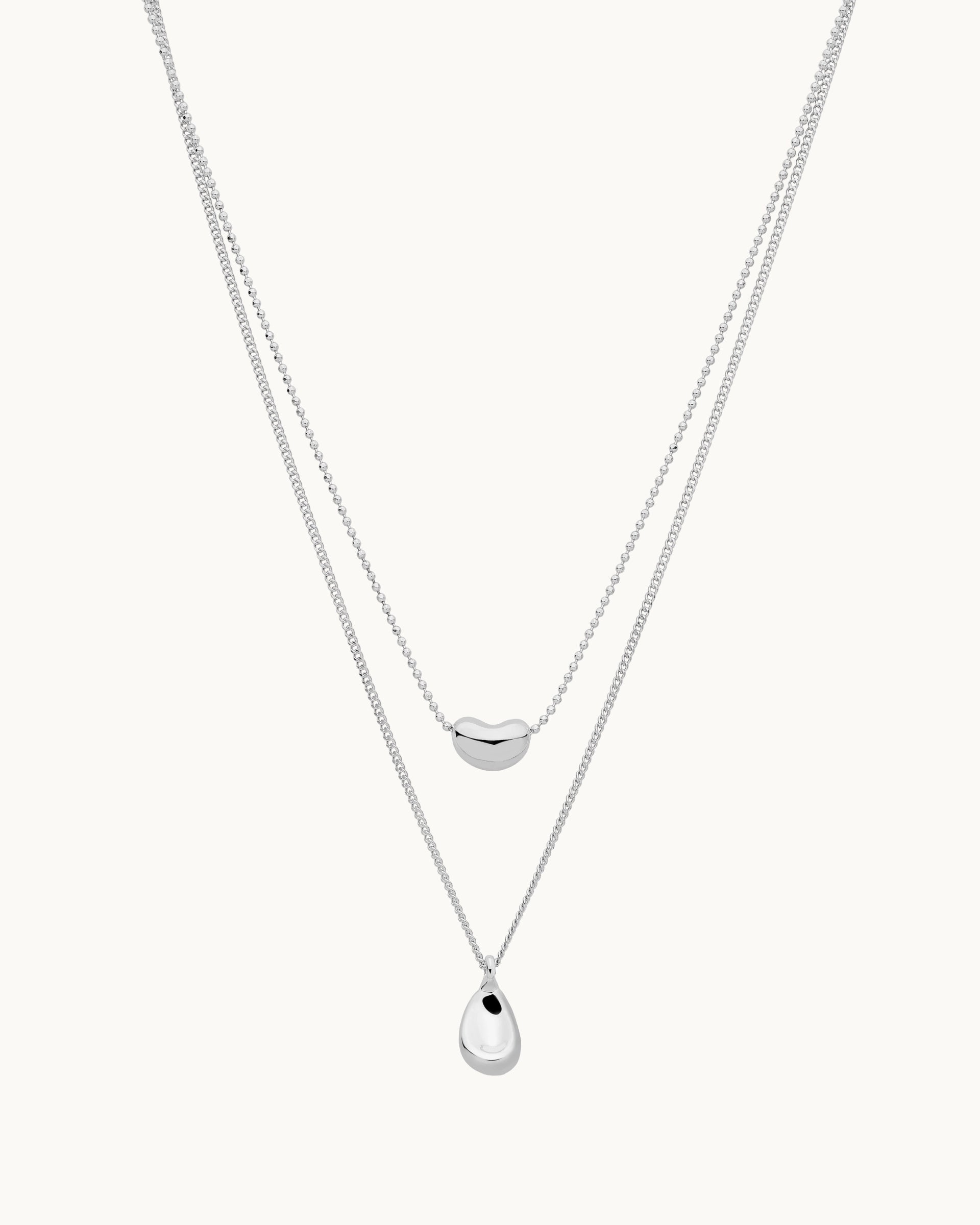This layered necklace set features two fine chains accented with smooth, sculptural pendants for a clean, modern look. Designed with soft curves and subtle movement, it adds understated elegance to everyday outfits while remaining effortlessly refined for special occasions.
