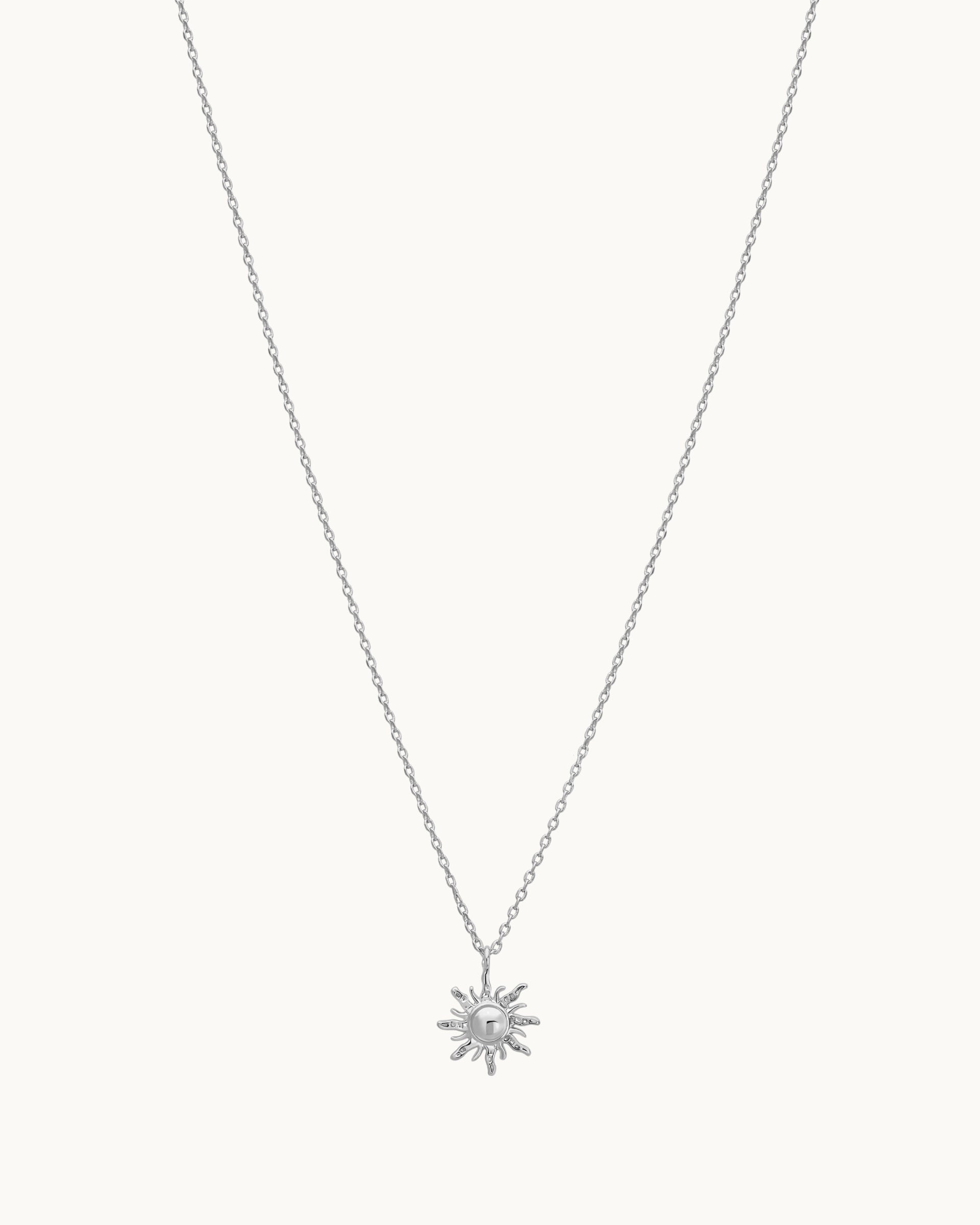 Radiant and full of character, this necklace features a detailed sun pendant with textured rays extending from a polished centre. The dimensional design captures the warmth and energy of the sun, creating a charming statement while maintaining a delicate, wearable silhouette.
