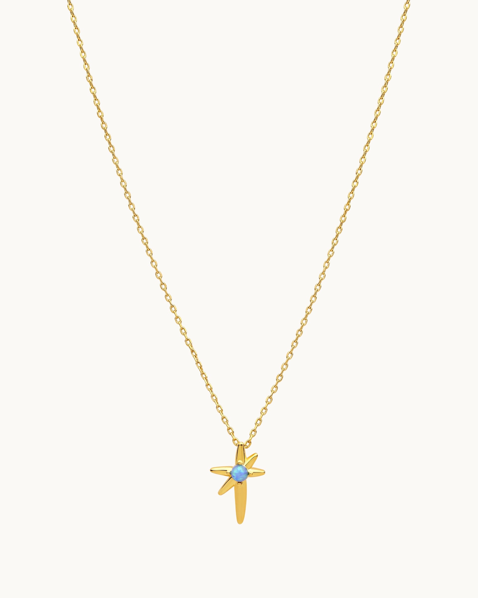 Delicate and luminous, this necklace features a sleek starburst pendant centred with a captivating opal stone that reflects soft flashes of blue and iridescent hues. The polished gold-tone finish enhances its celestial silhouette, creating a subtle yet eye-catching sparkle that sits beautifully along the neckline.